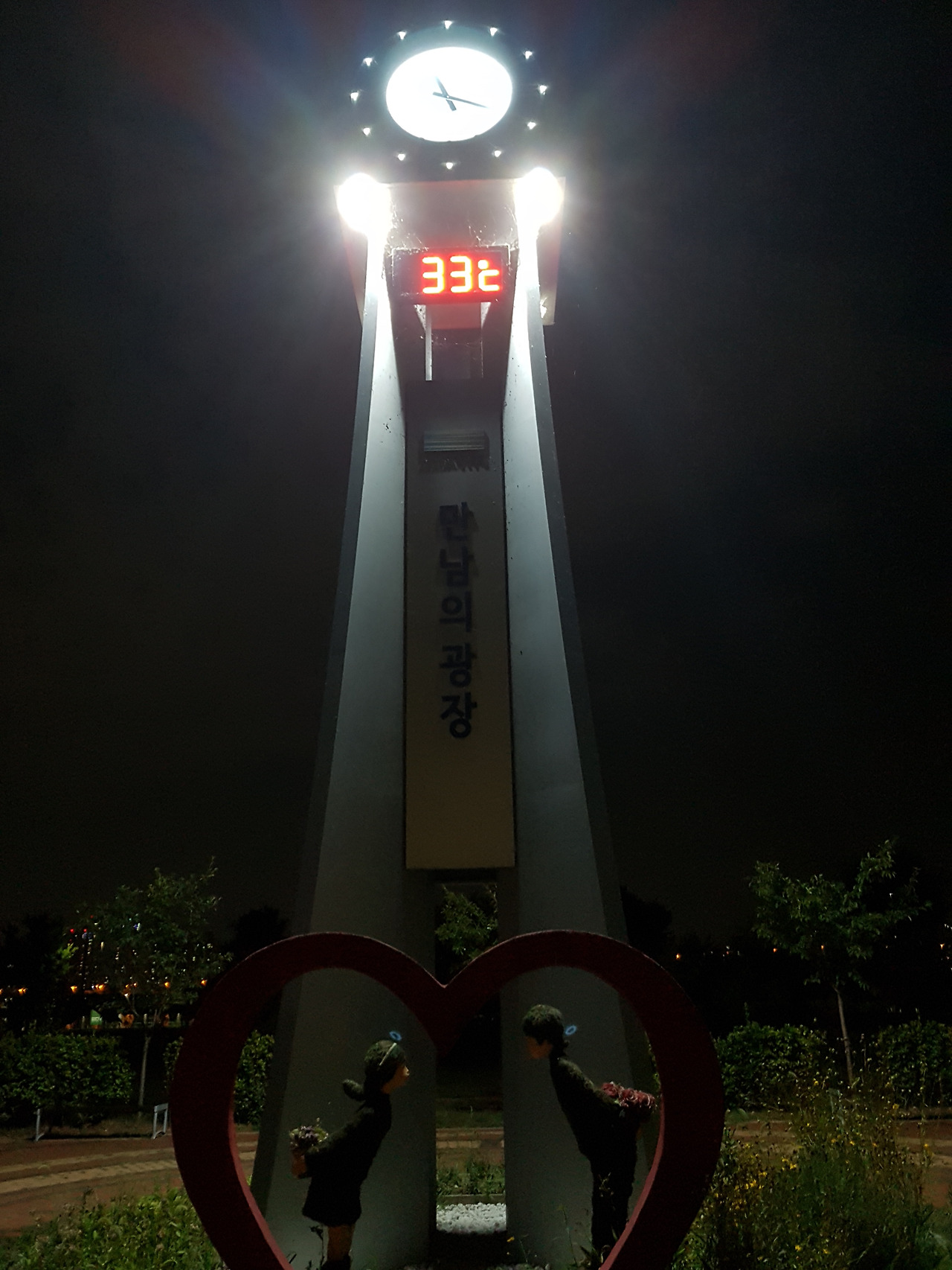 저녁 9시가 넘어 집근처의 한강잠실공원에 나갔다. 공원 시계탑의 온도계는 33℃였다. 무더운 여름밤이었다. 간간히 불어오는 강바람이 무더위를 식혀주었다. 늦은 밤인데도 더위를 피해 산책하는 사람들이 쾌 많았다.