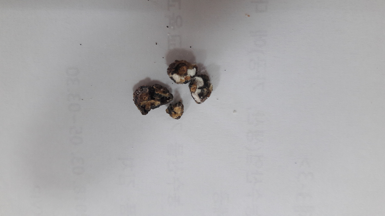 사무실에 가지고 가서 7일 나온 씨와 비교해 보고 사진을 찍었다. 그런 후 돌멩이로 두들겨서 씨를 쪼개보았다. 그 중 1개는 배(胚)와 배유(胚乳, 씨젖)로 보이는 하얀 알맹이가 있었고, 나머지는 텅 비어 있었다.