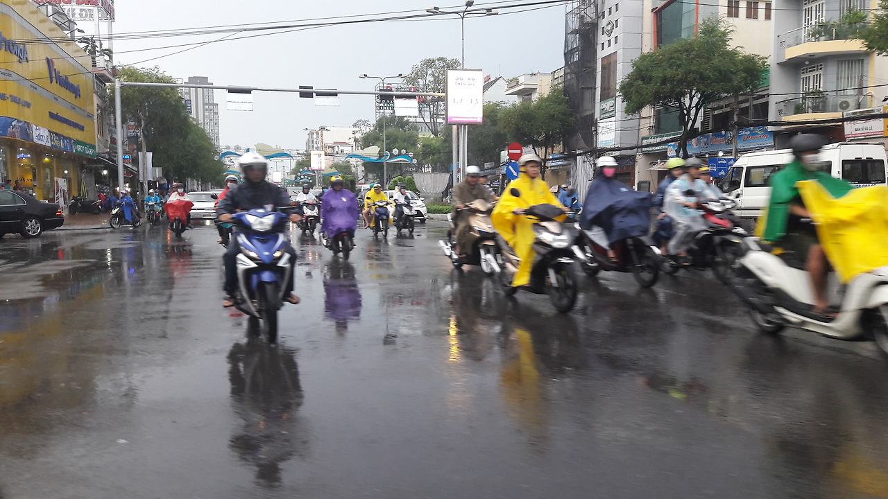 베트남, 특히 여기 껀터 사람은 대부분 오토바이를 타고 다닌다. 그러니까 비가와도 우산받기가 힘들다. 이 때문에 비가 오면 우산을 받는 대신 비옷을 입는다.