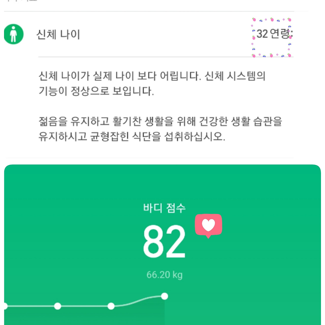 현제 체중은 67~66Kg으로 정상체중을 유지하고 있다. 신체점수는 82점, 신체나이도 내 나이보다 13살이나 어리게 나왔다.(살짝 자랑) 운동도 중요하다지만 역시 다이어트를 위해서는 탄수화물과 당류를 조절하는 식습관이 가장 중요한 것 같다.