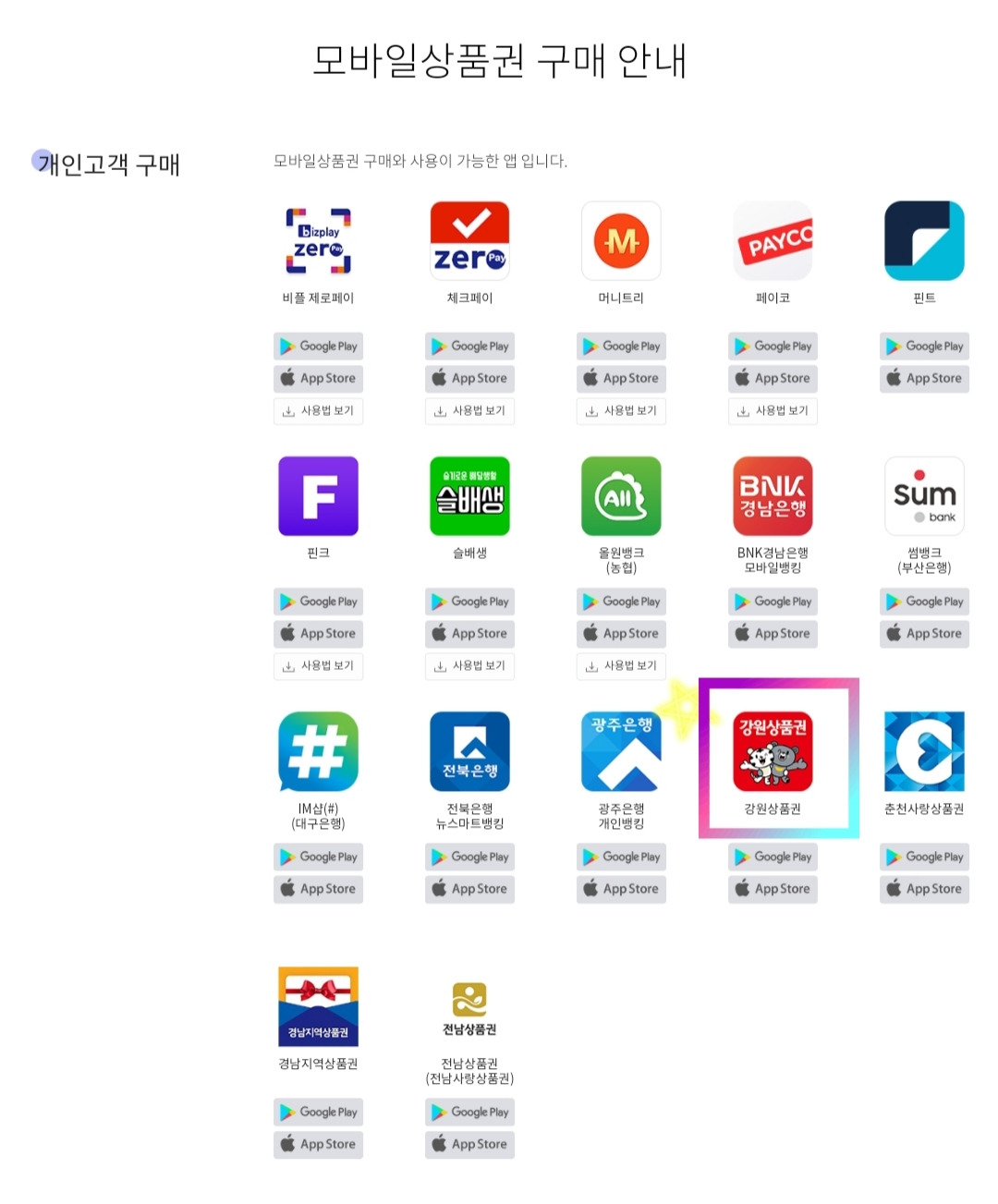 유주사는 "강원상품권"이라는 모바일앱을 사용하는데 Play Store에서 "강원상품권"으로 검색하면 쉽게 찾을 수 있다.
