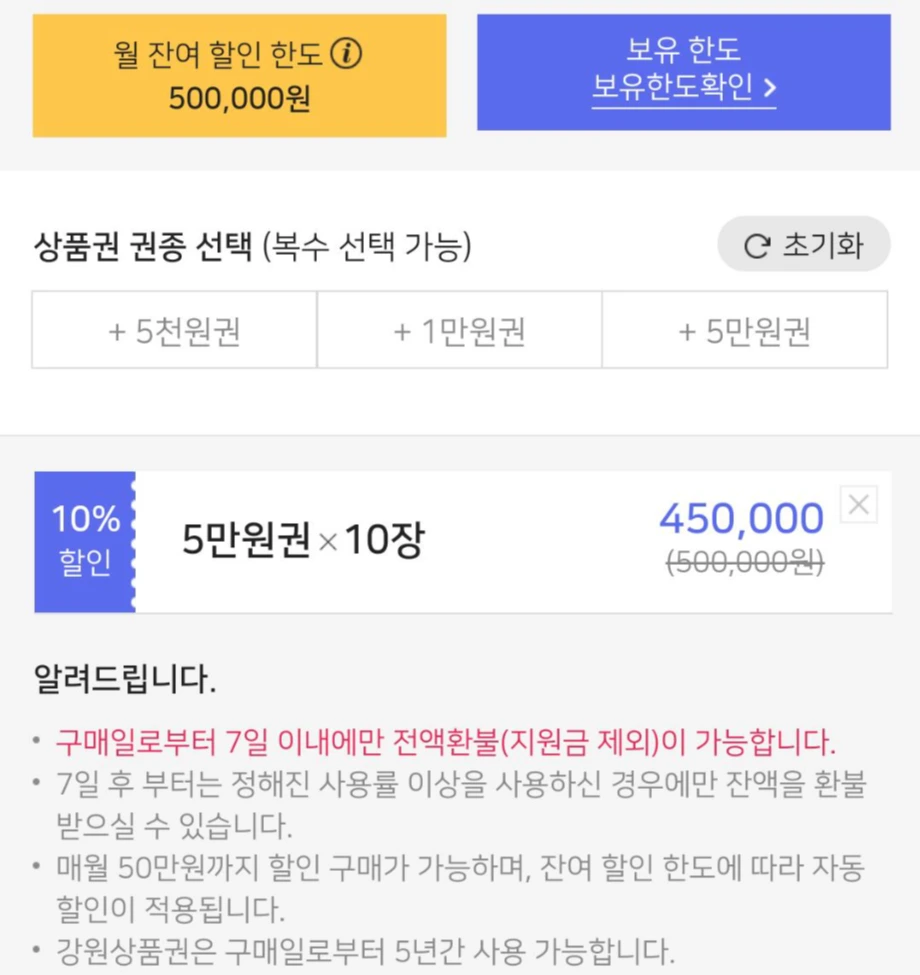강원상품권, 춘천상품권은 할인율이 10%로 월 할인한도는 50만 원