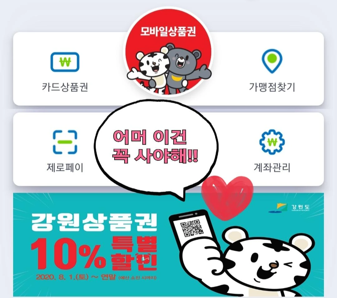 일단 강원도 사시는 우리 가족, 문희 언니, 은숙 언니는 강원모바일 상품권 꼭 사시고, 강원도 안 사시는 분들은 일단 제로페이 앱을 까시고 우리 동네에 이런 상품권을 살 수 있는지 꼭 챙겨보시면 좋을 것 같다.