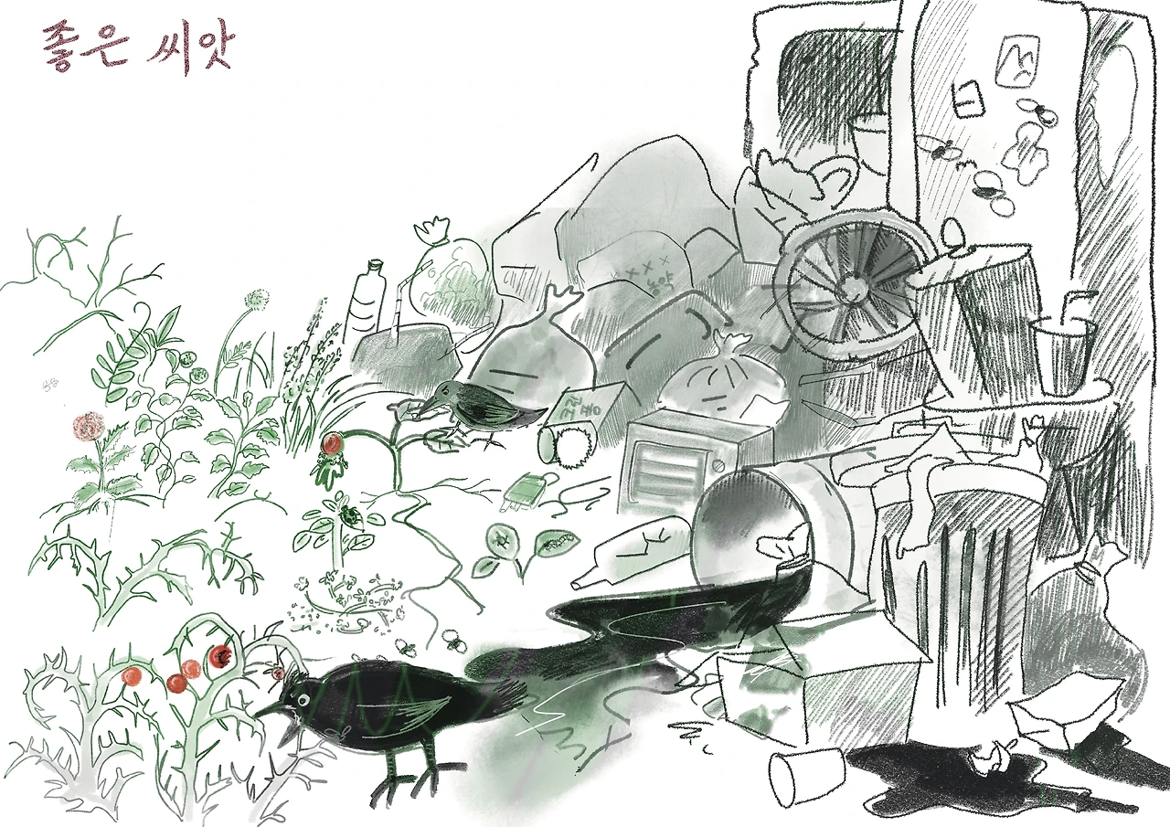 진득하고 끈끈한 폐식용유와 철근이 박힌 시멘트 덩어리에 눌려 땅은 숨조차 쉬기 힘들어졌어요.