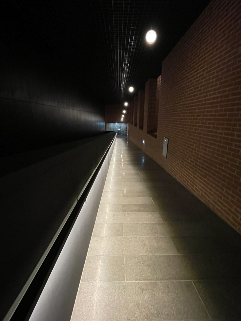 검정, 금색, 붉은색이 교차하며 조화롭게 어우러진 내부는 차분하면서도 고요함이 감돈다. 공간이 머금은 은은한 빛은 그림자와 함께 이 장소의 의미를 기록하고 있다. 건물 전체가 지하로 이뤄져 있다 보니, 제한적으로 유입되는 자연광을 통해 공간의 깊이감이 걸을 때마다 몸으로 체감된다.
