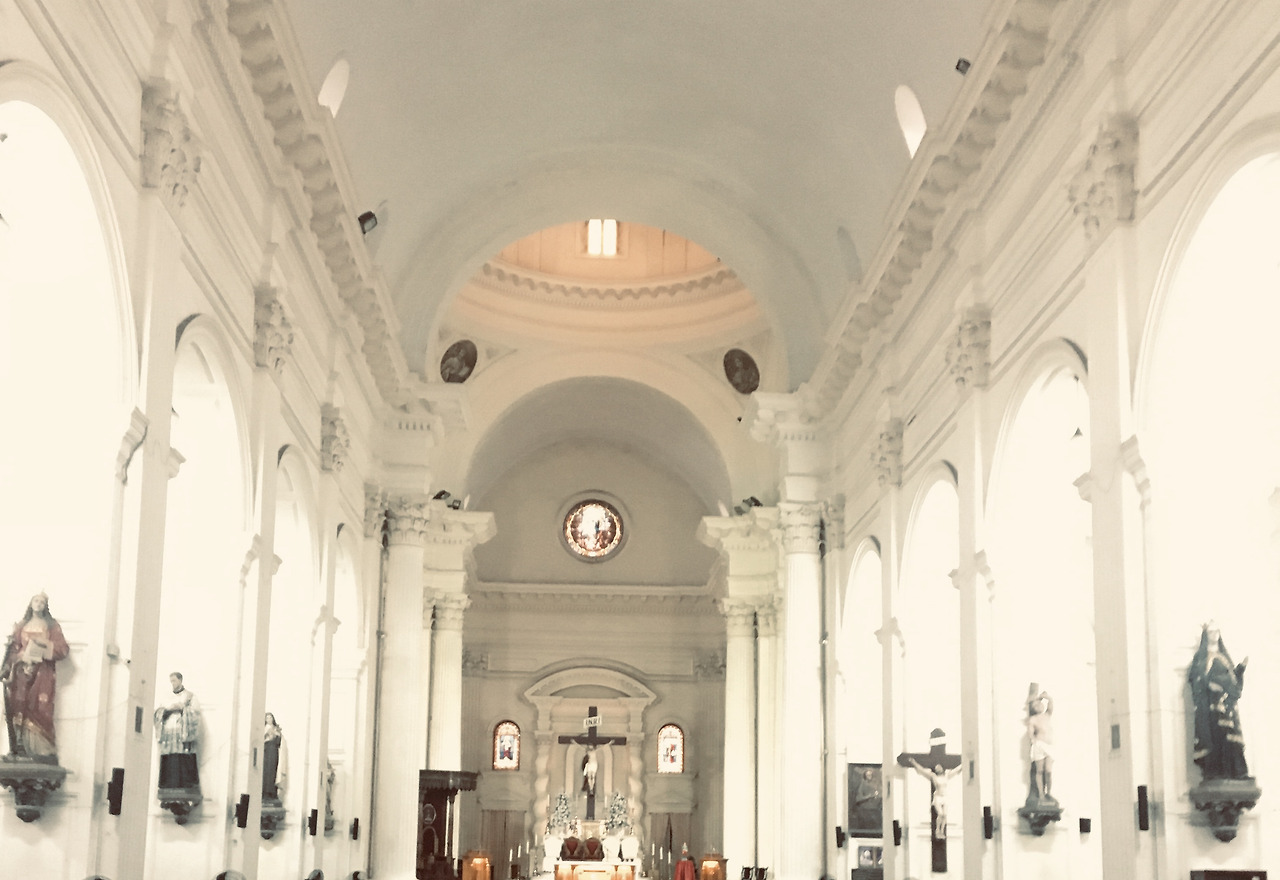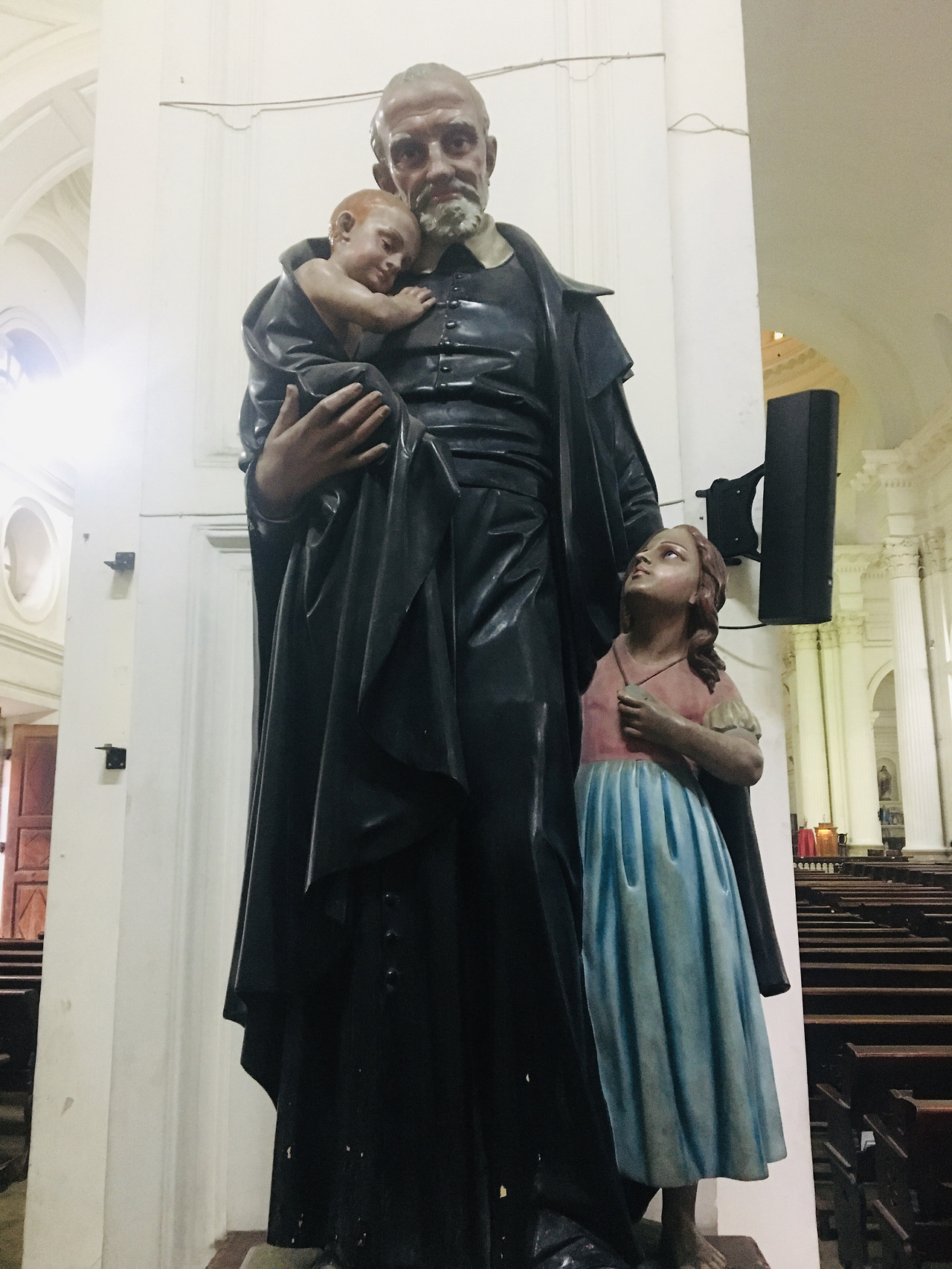 제단은 다른 화려한 곳에 비해 정말 있어야 할 것들만 존재해서인지 유난히 예수님이 가장 잘 보였다. 대리석으로 이뤄진 3개 층의 바닥 그리고 티크 나무로 정교하게 조각된 교구장님의 보좌 카테드라(Cathedra)도 눈에 들어온다. 그리고 무엇보다 특별한 건 명동성당엔 재단 뒤에 반원형의 열 네분의 사도화가 있다면 이곳에는 성인들이 신자들 속으로 들어와 계신다. 성당을 지탱하는 거대한 기둥엔 열 두 사제와 알로이시오, 프란시스 하비에르, 빈센트 드폴, 세실리아, 요한 세례자 드 라살 성인 성녀들이 입체적인 표정과 각자의 영성을 담은 모습들로 함께하고 계신다. 특히 가난한 사람들이 교육받을 수 있도록 평생을 헌신한 요한 세례자 드 라살 성인과 빈민들을 예수님과 같이 섬기던 빈첸시오 드 폴 성인을 이곳에서 마주할 줄이야. 성인 성녀들의 숭고한 삶의 궤적이 가깝고도 친근하게 느껴져 얼마나 많은 사람들이 이 성상에 손을 얹고 기도를 할지 저절로 상상이 된다.