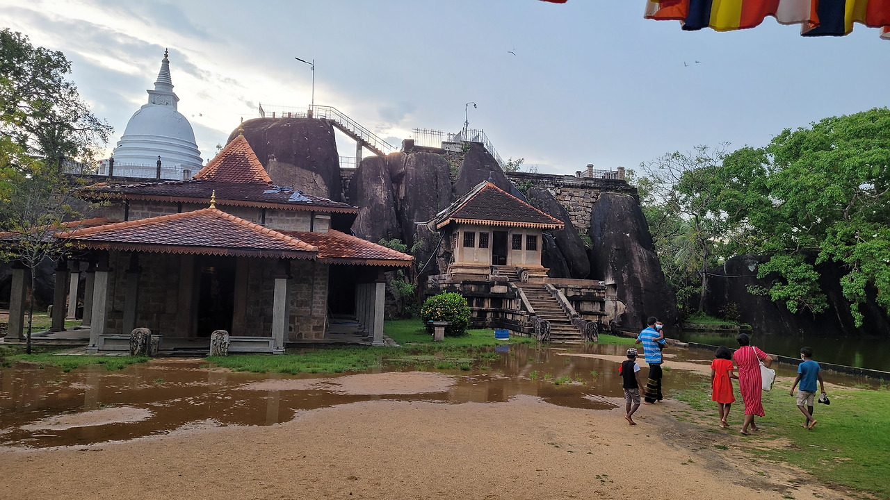 다행히도 오는 길에 비가 개이고 파란 하늘이 빼꼼 고개를 내밀었다. 조금 늦었지만 해가 지기 전에 계획했던 사원들도 다 둘러볼 수 있었다. 그중 첫 번째 장소는 바위 위에 조성된 스리랑카의 최초 사원인 이수루무니야이다. 바위를 파내 듯이 지어진 불당과 바위 위에 다고바 그리고 밝은 색으로 칠해진 법당까지 규모는 크지 않지만 뭔가 이색적인 느낌이다. 오전에 온 비로 사원 입구는 작은 웅덩이가 생겨 발목까지 찰랑거린다. 천연 동굴을 활용해서 지어진 지라 법당에 제비집이 그대로 있어 작은 새가 날아다니고 작은 터널로 박쥐들까지 보인다. 동굴 사원 위에 올라 보니 도시가 한눈에 내려다 보이고 어느덧 해가 뉘엿뉘엿 지고 있었다.