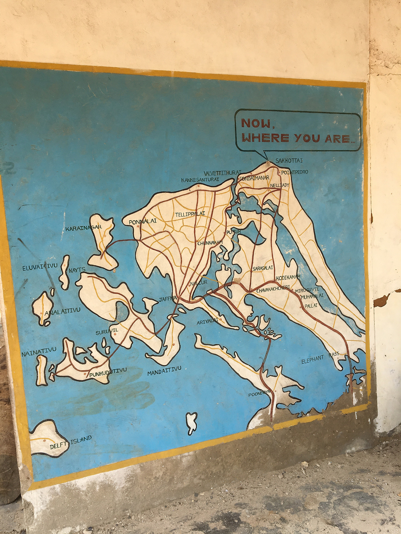 27년의 긴 내전 이후 스리랑카엔 물리적으로 보이지 않는 마음의 휴전선이 남아있다. 부임 후 첫 출장으로 북부 주를 가면서 차창밖으로 처음 느꼈던 풍경이 그랬다. 콜롬보를 벗어나 북쪽으로 가면 갈수록 길은 험해지고 글자는 동글동글에서 네모네모 해진다. 차로 편도 9시간 거리상으로도 멀지만 이렇게 늦어지는 이유는 북쪽으로 올라갈수록 길목마다 체크 포인트가 더 자주 등장하기 때문이다. 그리고 자프나 도심에서도 한 시간 더 북쪽으로 올라가면 해안길을 따라 그물을 엮는 어부들의 삶의 터전이 나온다.