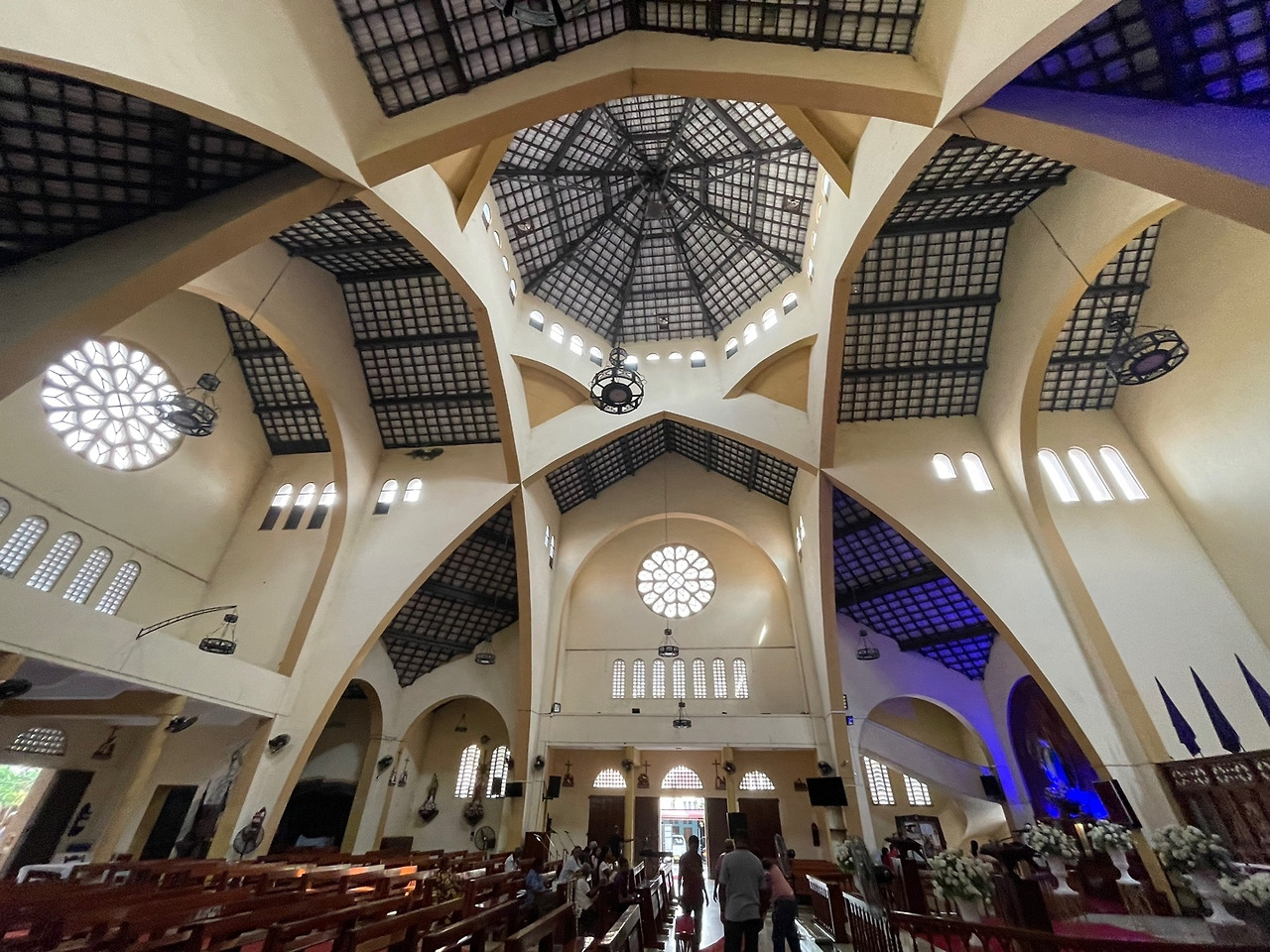 혼배미사 준비로 한창 바쁜 성전 내로 들어서니 성전의 깊고 넓은 공간감이 나를 압도한다. 벌집을 연상시키는 육각 돔 그리고 직물처럼 가지런히 짜인 기하학적 지붕 위로 한낮의 햇빛이 끝없이 쏟아져 들어온다. 스테인글라스 하나 없이도 성당이 주는 빛의 미학을 온전히 느낄 수 있다. 성전 곳곳에 놓인 자색 깃발은 아직 기다림의 시간임을 보여주지만 기쁨의 부활을 기다리며 소리 높여 마음을 봉헌하는 가족이 눈에 띈다. 에우제니오 성인 발 밑에서 한참을 노래하듯 읊어 내려가던 시 구절 같은 기도까지... 이곳에서는 어쩐지 간절하고도 절절한 신자들의 기도소리가 유난히 귓가를 맴돈다.