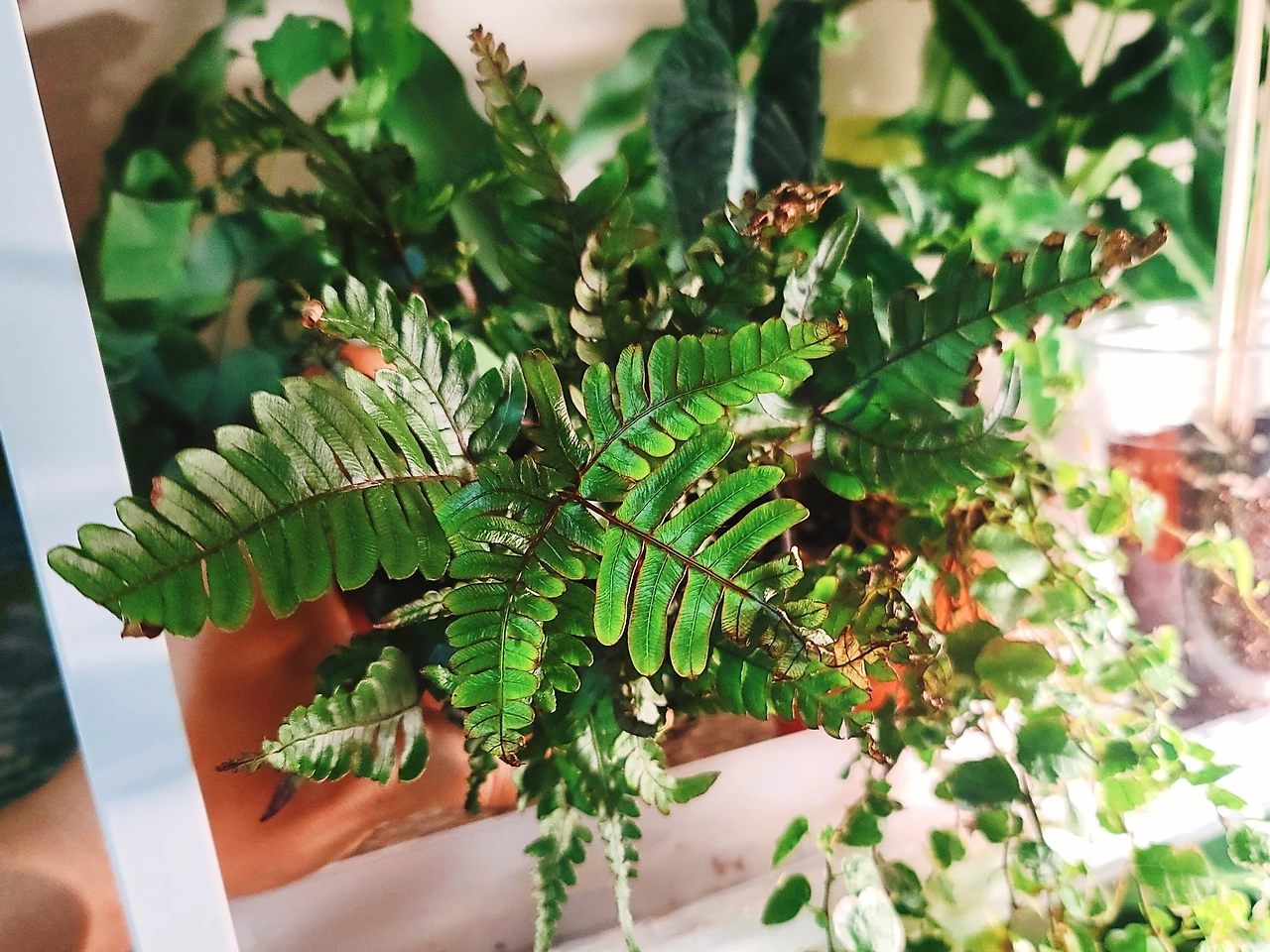 저면관수를 시작하고 나선 죽이는 식물이 없게 되자, 물관리는 껌이라고 말 그대로 자신감이 하늘을 찔렀다. 그리곤 가장 키우기 어렵다는 아디안텀과 삼색고사리, 블랙벨벳 알로카시아, 핑크 싱고니움, 블루스타펀 등을 신나게 들였다. 이들은 물 주기가 제각각이다. 알로카시아 중에서도 블랙벨벳은 아주 천천히 물을 먹고, 싱고니움은 물을 아주 좋아한다. 반면에 아디안텀은 습한 것을 질색하면서도 공중습도가 높은 것을 좋아하는데, 블루스타펀은 아디안텀보다는 뿌리가 습한 것에 강하다. 이렇게나 특성이 다양한데 다 같이 쟁반에 두고 키웠으니 결과는 참혹했다. 블루스타펀과 알로카시아만 살아남았는데, 알로카시아는 뿌리를 거의 잃다 시 피했다.