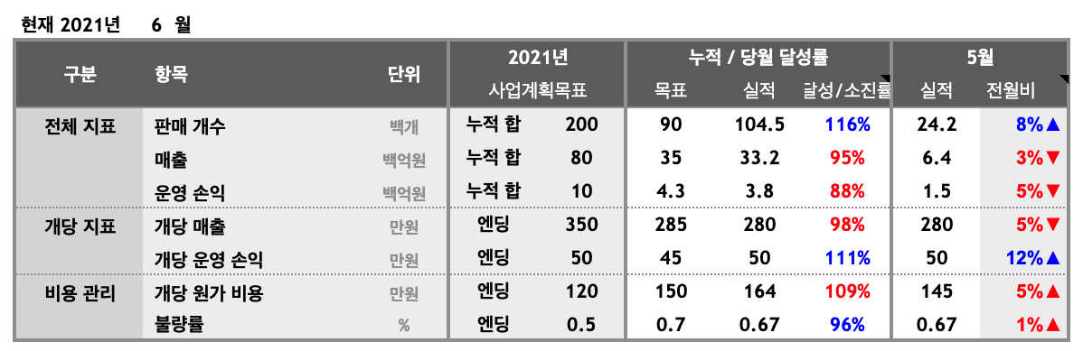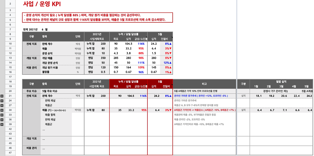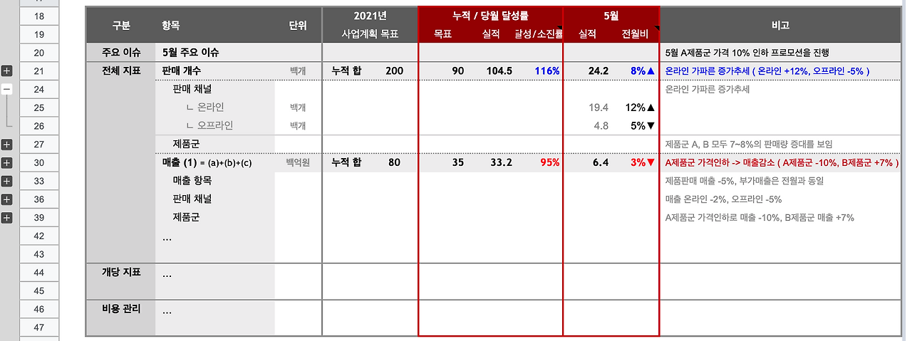 마지막으로는 세부 사업지표로, 위의 KPI 지표 달성률에서 파생되는 질문들에 답하는 역할이다. 예를 들어 경영진이 위의 KPI 달성률을 보고 "판매개수 달성률이 116%로 초과 달성된 이유는 무엇이죠?"라고 질문할 수 있다. 이때 아래의 세부지표는 "온라인 판매량이 전월대비 12% 증가하면서 초과 달성되었다"는 사실을 알려준다. 세부사항은 "그룹화" 기능을 통해 접거나 펼칠 수 있도록 구성하는 게 좋은데, 중요한 세부사항에 대해서는 굳이 펼쳐보지 않더라도 비고란을 통해서 메시지 형태로 전달하는 것이 좋다.