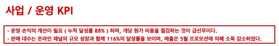 그럼 KPI 모니터링 시트의 레이아웃을 구성해보자. 첫 번째로 월별로 경영진에 공유 필요한 중요한 메시지를 요약한다. 이 메시지는 경영진의 머릿속에 기억될 것이므로, 반드시 핵심적이고 중요한 숫자들로 이루어져야 한다.