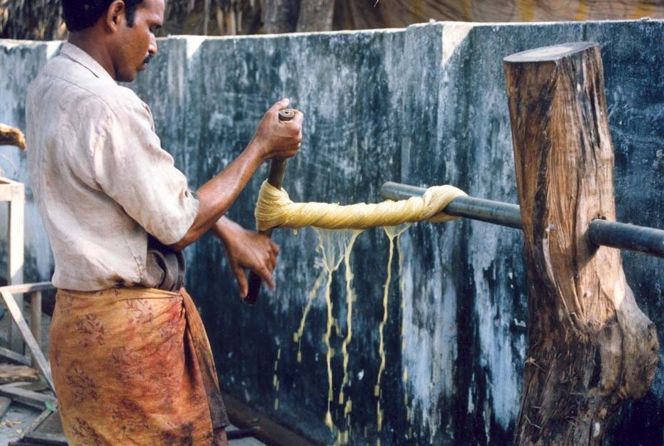 프린팅이 끝난 천은 뜨거운 방에 둔 채 쪄내듯 하여 1차로 색을 고정시킨다. 이 과정이 끝나면 야외에서 이삼일 물에 담가 불순물이 빠져나가게 하고, 내리치고 헹구고 비틀어 짜는 세척을 거친 후 햇볕에 바짝 말려 2차, 마지막으로 천을 다림질해 3차, 모든 프린팅을 단단히 고정한다.