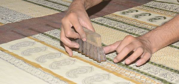 블록은 크게 세 가지로 구분하는데 옅은 염료로 스케치를 하듯 찍어내는 렉(Rekh, outline block), 바깥 라인을 찍는 것(Gudh, background block), 패턴 내부에 색을 채우는 두타(Dutta, filling block)의 세 가지다. 가장 뛰어난 마스터가 렉(Rekh)을 잡는데, 이 작업이 이후 작업의 지도와 같은 역할을 하기 때문이다.