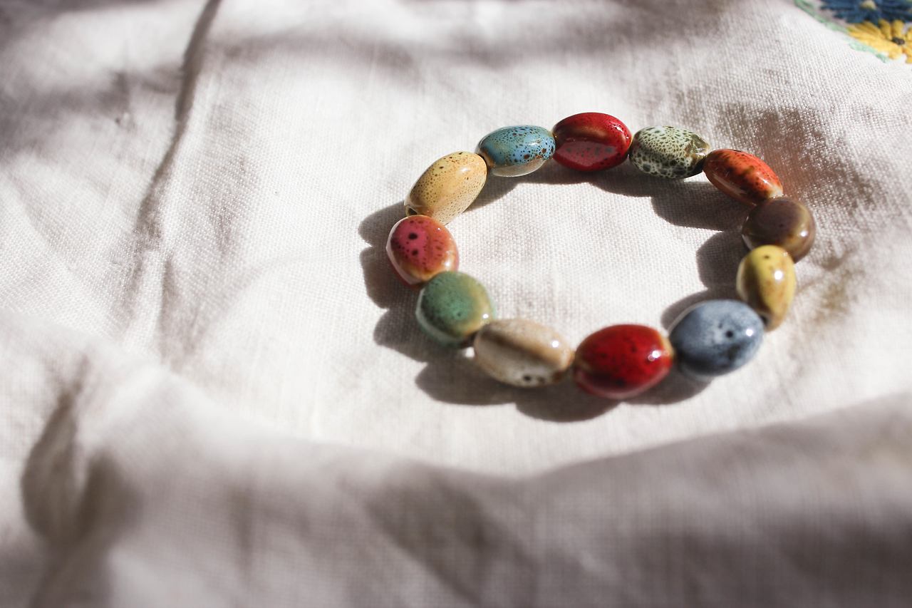 반들반들하고 납작한 돌멩이라 느낌이 편안하다. 팔에 차도 자국이 안 남는다. 은근히 알록달록 귀여운데 색감이 튀진 않는다. 자연스럽다. 다른 팔찌를 레이어드해도 나쁘지 않다 등등.