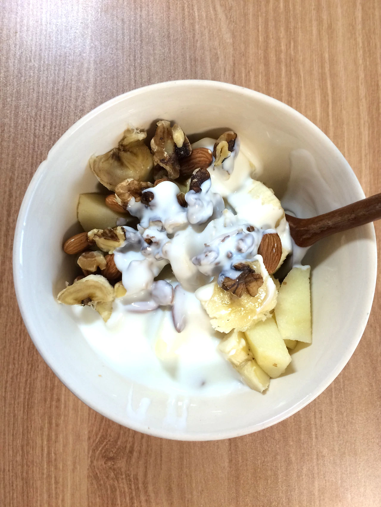 고향집에 가거나 여행 중일 때를 제외한 일 년의 300일 이상은 똑같은 순서로 움직인다. 매일 아침식사는 사과 한 개, 바나나 반 쪽, 견과류와 직접 만든 요구르트다. 유산균을 위한 나무 숟가락 사용도 잊지 않는다. 자취생 치고 꽤 훌륭한 식사다. 이 식사는 나의 유일한 시리얼 볼에 담아 먹는다. 미우나 고우나 일 년에 300일 이상은 이 그릇과 마주하는 셈이다.