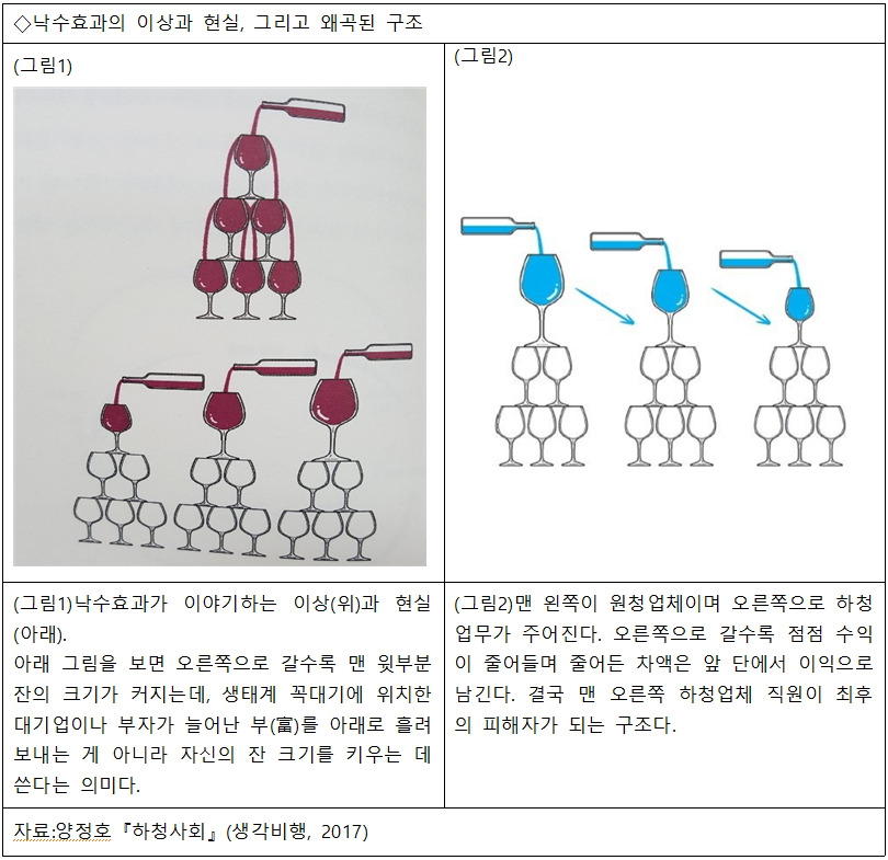 노동문제를 주로 연구하는 양정호 박사는 그림(1)의 경우 “이론적으로 위쪽 그림처럼 낙수효과가 선순환하면 이익은 갑과 을에게 공평하게 공유된다. 그러나 실제로는 그런 일은 일어나지 않는다. 아래쪽 그림처럼 갑의 잔만 계속 커질 뿐”이라고 설명한다. 그림(2)는 왼쪽에서 오른쪽으로 도급을 주고받는 하청관계를 보여주는 것으로, 양 박사는 이에 대해 “왼쪽에서 오른쪽으로 넘어갈수록 맨 위 칸의 와인 양이 줄어들고 있음을 확인할 수 있다. 이것이 바로 전형적인 도급관계, 즉, 외주 혹은 하청관계에 있는 갑과 을의 처지”라고 풀이했다.
