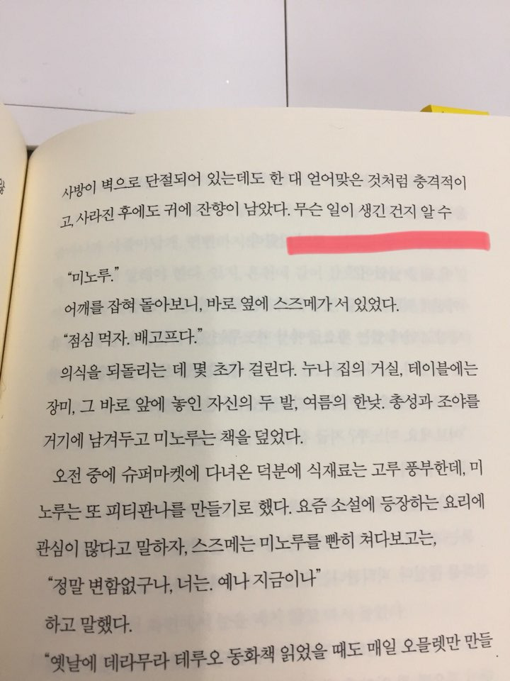 얼마 뒤 고객센터에서 친절한 답장이 왔고, 일단 불편을 끼쳐 죄송하단 말과 함께 확인 과정이 필요하니 잘못된 페이지를 알려주거나 사진을 찍어 보내달라는 거였다. 그래야 자기들이 출판사에 문의할 수 있다고. 일리 있는 말이다. 나는 표시해둔 페이지의 쪽수를 적다가 아니다 싶어 아예 휴대폰 사진을 찍기 시작했다. 근데 뭔가 뒤통수가 싸해지기 시작했다.
