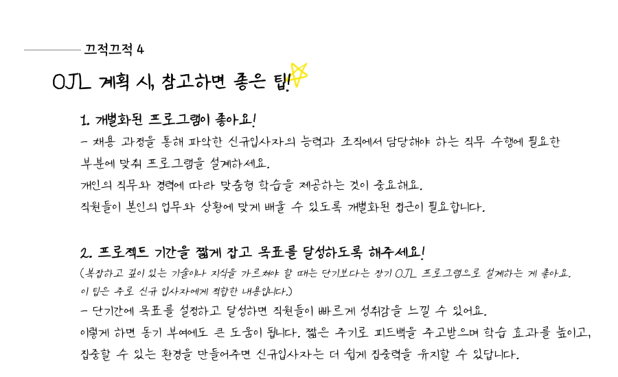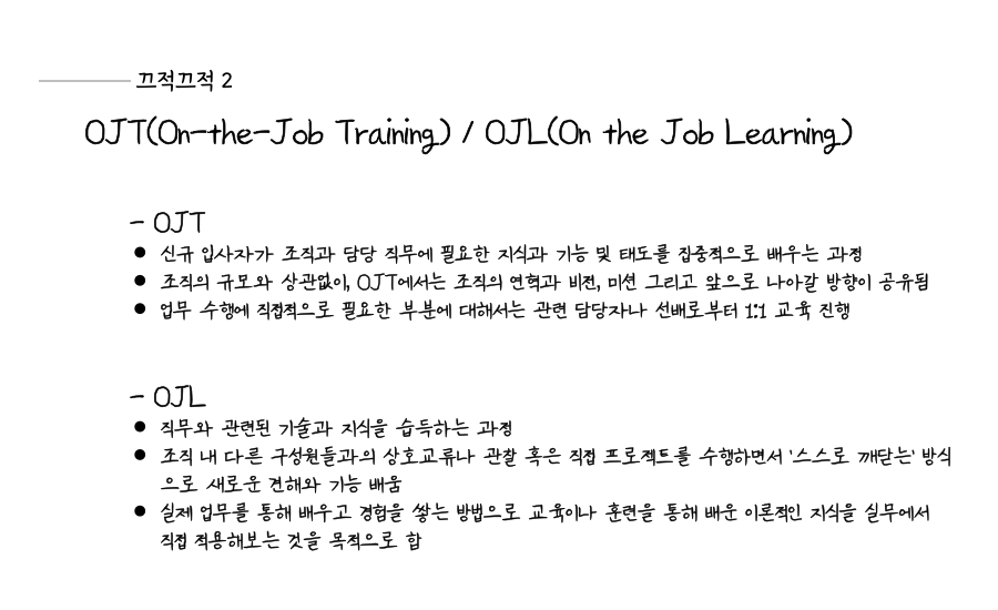 OJT와 OJL은 새로운 구성원이 조직에 잘 적응하도록 돕는 훌륭한 프로그램이에요.