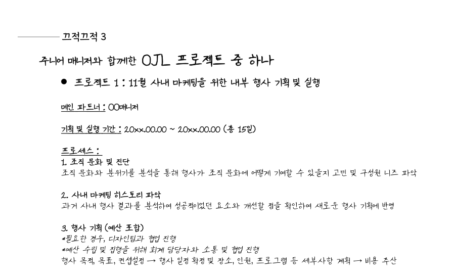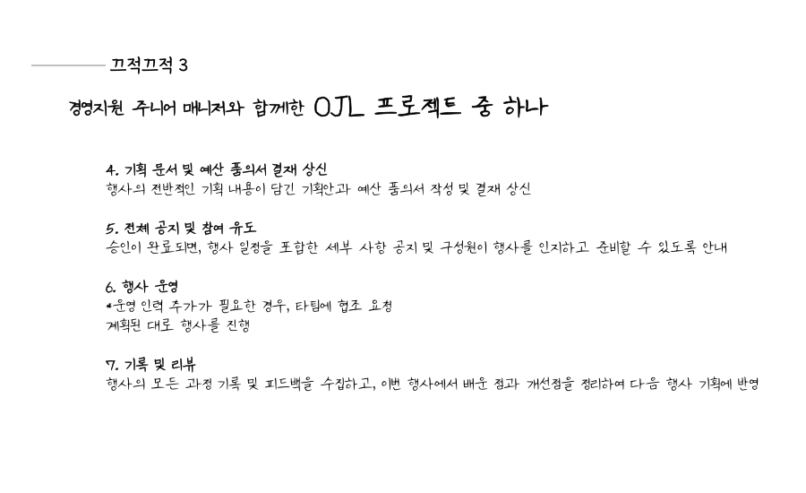 그래서 OJL이 더 많이 활용되면 좋겠다고 생각해요. 실제 업무에서 부딪히며 얻은 성취의 경험은 책이나 강의로는 배울 수 없는 소중한 자산이니까요. 이런 프로그램이 널리 퍼져서 많은 사람들이 성장할 기회를 가질 수 있으면 좋겠습니다.