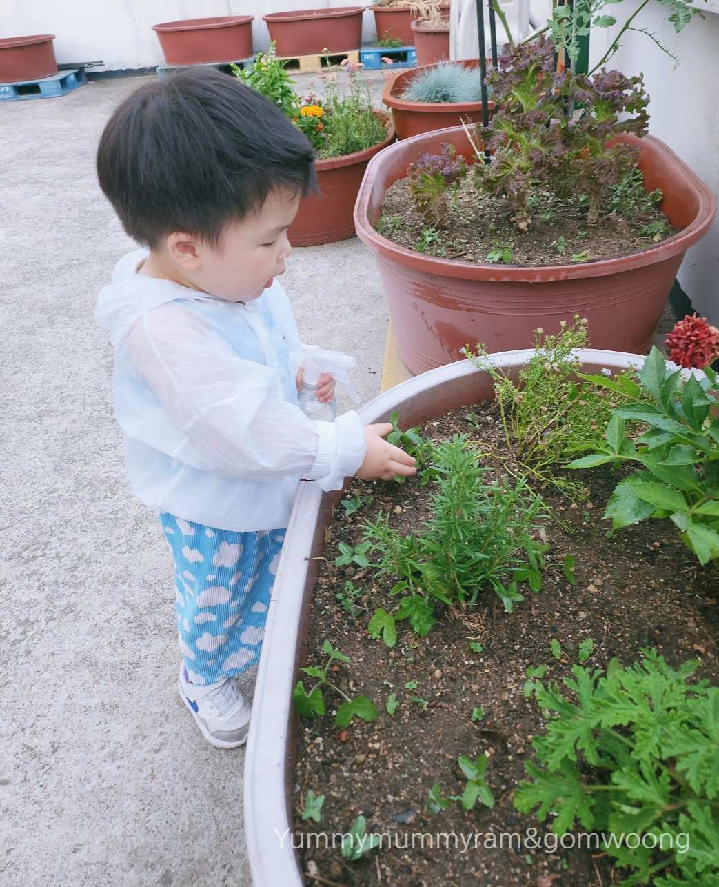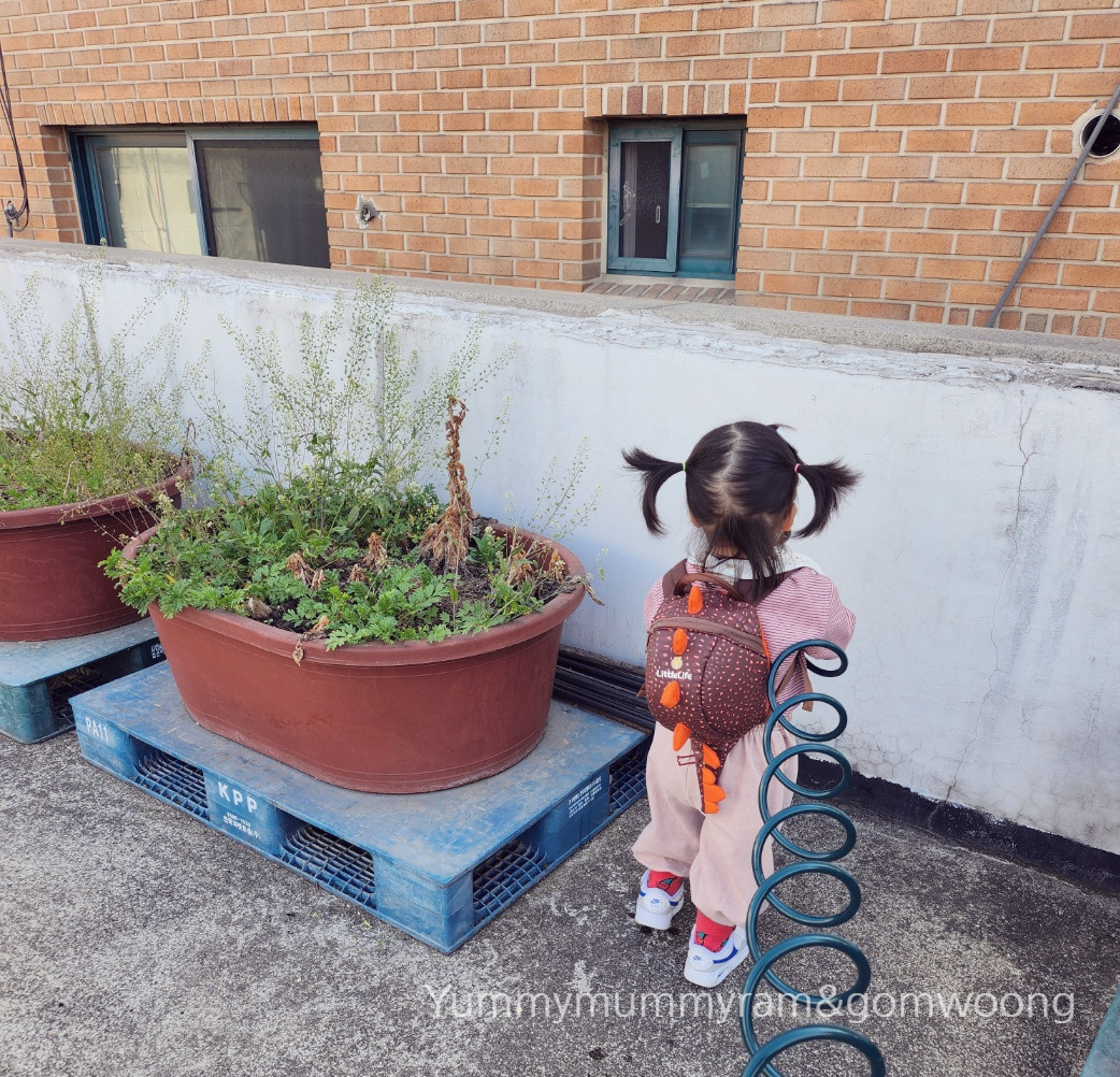 저는 곰웅이의 유년기를 자연으로 가득 채워주고 싶었어요. 그래서 하루에 최소 34분 이상은 야외 활동을 하겠다는 목표를 세웠습니다. 곰웅이네 옥상에는 이사 올 때부터 잡초가 무성한 대야 7개가 자리 잡고 있었어요. 자연으로 가득 채워보겠다는 결심을 하게 된 만큼, 직접 작은 자연을 만들어보기로 했답니다.