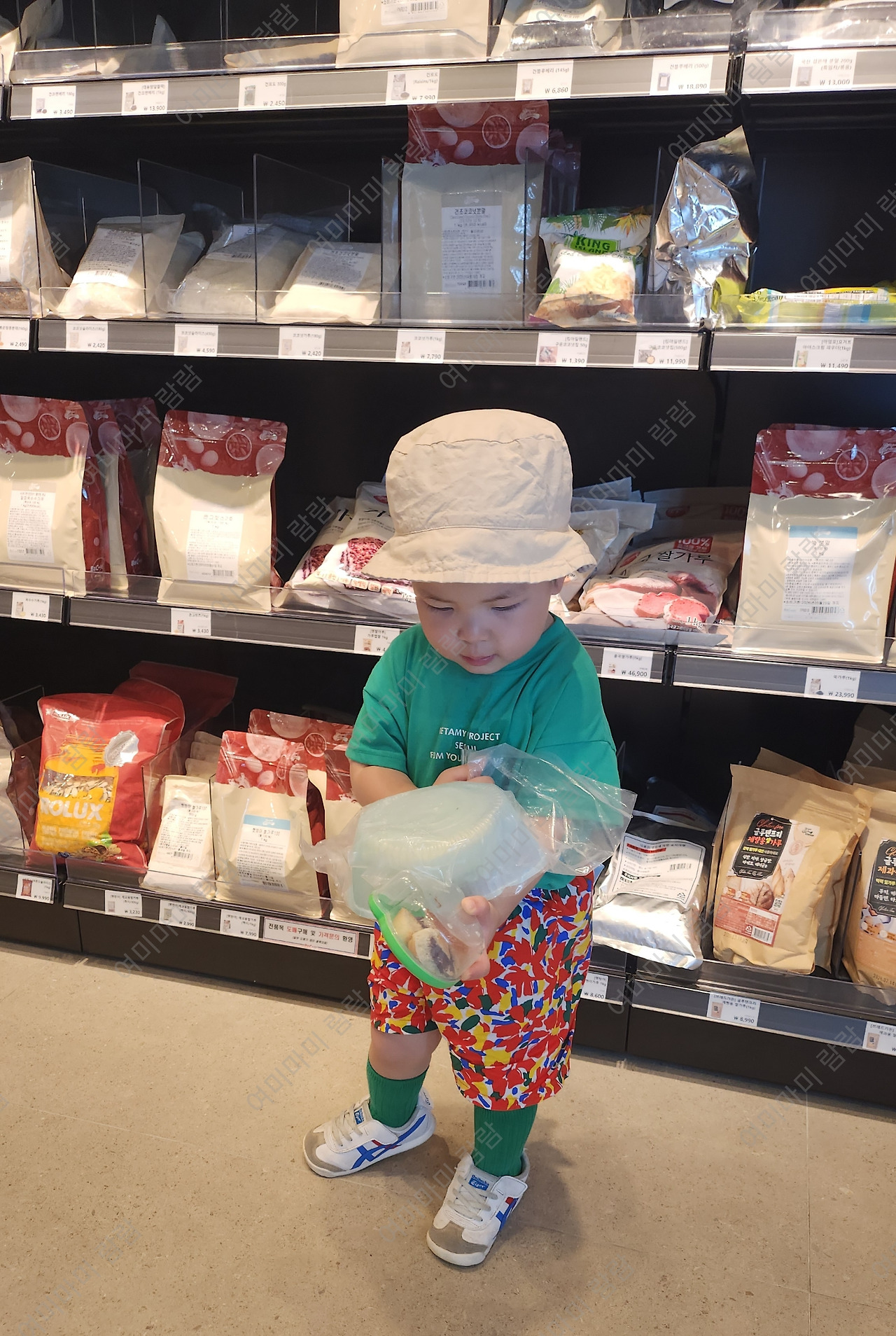 하원 시간이 되자, 무더운 날씨에 땀이 주르륵 흘렀지만, 엄마와 곰웅이는 빠른 걸음으로 베이킹 재료 가게로 총총 걸어갔어요. 가게에 도착해서 엄마와 곰웅이는 “안녕하세요!”라고 씩씩하게 외치고는, 쇼핑 바구니를 들고 재료를 쓱쓱 고르기 시작했죠. 냉장고에서 케이크 시트와 휘핑크림을 꺼내들 때부터, 몽글몽글한 딸기 생크림 케이크가 머릿속에 그려지며 두 사람의 마음은 두근두근 설레기 시작했어요.