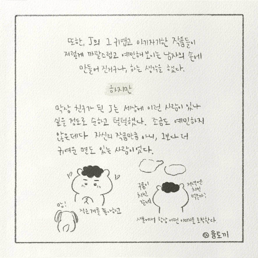 막상 친구가 된 J는 세상에 이런 사람이 있나 싶을 정도로 순하고 털털했다. 조금도 예민하지 않은 데다 자신의 작품만큼 아니, 그보다 더 귀여운 면도 있는 사람이었다. 작은 동물을 좋아하고, 사물에서 항상 어떤 이미지를 포착해 나를 웃게 만들었다.