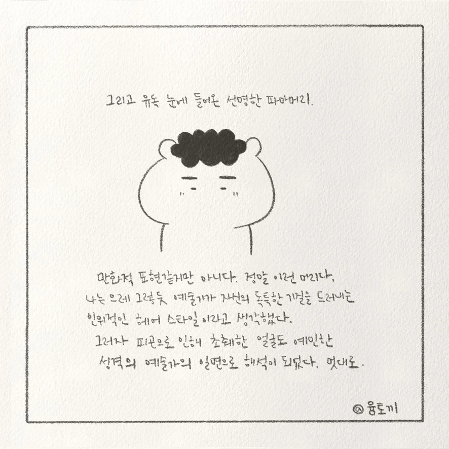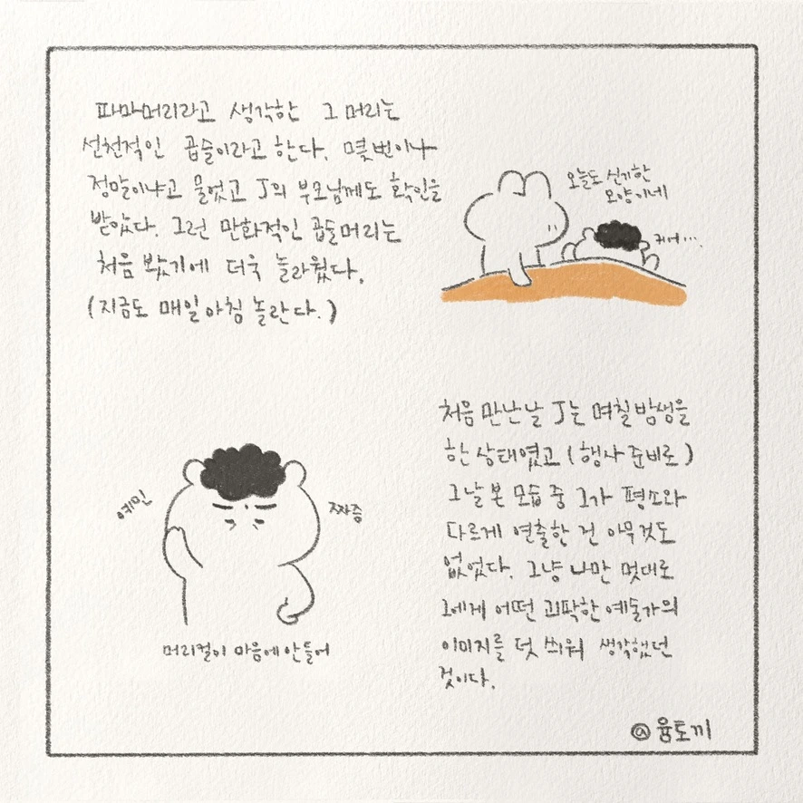 어찌어찌 J를 만나고 나서 유독 눈에 들어온 그의 인상 중 하나는 너무나도 말 그대로인 파마머리. 그림으로 그린 동글동글한 머리가 만화적 표현 같지만 아니다. 정말 그런 머리를 가졌다. 나는 으레 그렇듯 자세한 사정은 모른 채 예술가가 자신의 독특한 기질을 드러내는 인위적인 헤어스타일이라고 생각했다.
