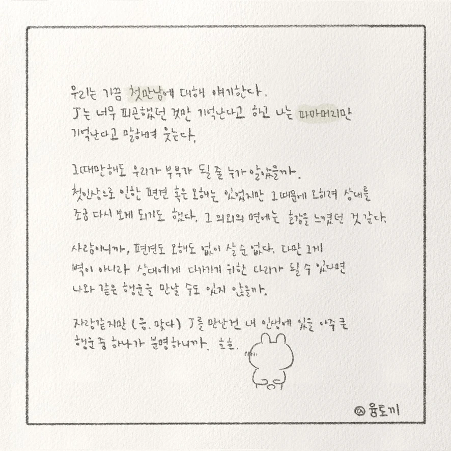 우리는 가끔 첫 만남에 대해 얘기한다. J는 너무 피곤했던 것만 기억난다고 하고 나는 파마머리만 기억난다고 말하며 웃는다. 그때만 해도 우리가 부부가 될 줄 누가 알았을까. 첫인상으로 인한 편견 혹은 오해는 있었지만(순전히 나 혼자만의) 그 때문에 오히려 상대를 조금 다시 보게 되기도 했다. 그 의외의 면에는 호감을 느꼈던 것 같다.