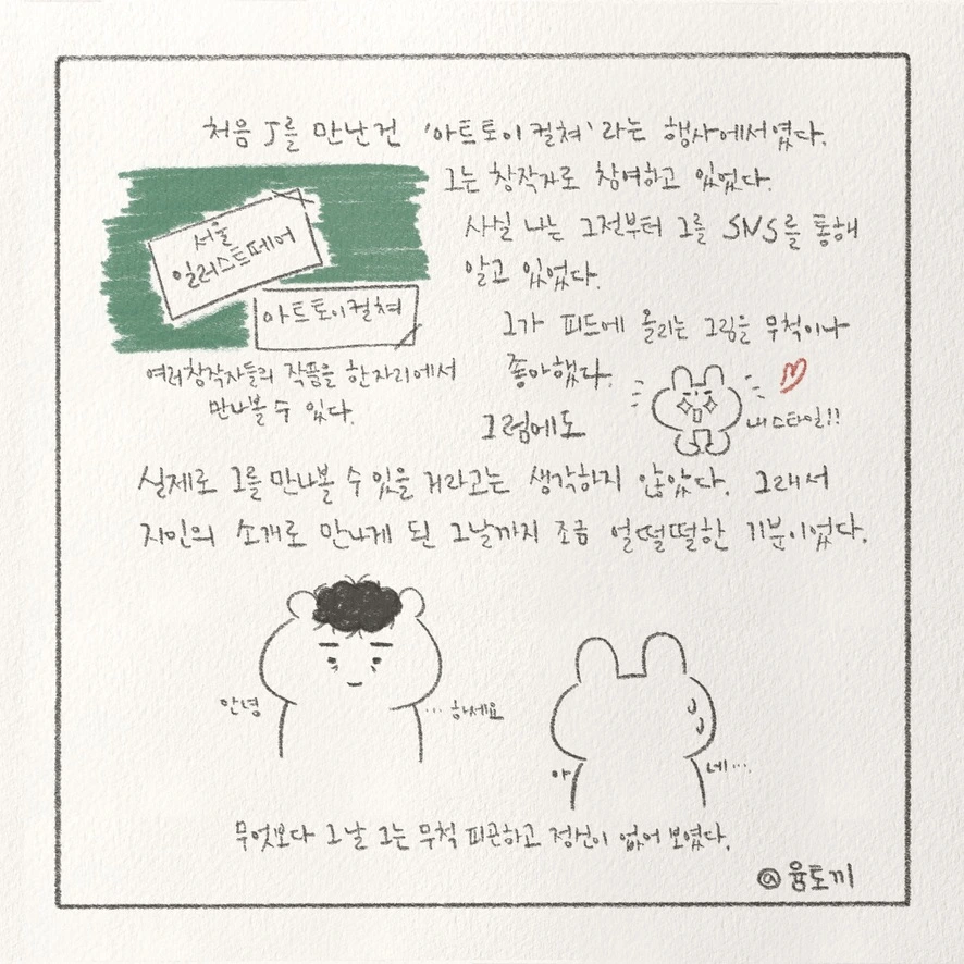 사실 나는 그를 만나기 전부터 sns를 통해 그에 대해 알고 있었다. J가 피드에 올리는 그림을 무척이나 좋아했다. 그럼에도 실제로 그를 만나볼 수 있을 거라고는 생각하지 않았다. 그래서 지인의 소개로 만나게 된 그날까지 조금 얼떨떨한 기분이었다. 무엇보다 그날 그는 무척 피곤하고 정신이 없어 보였다.