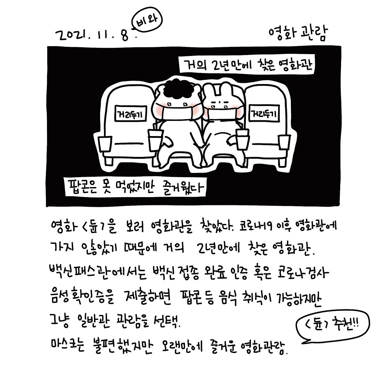 영화 <듄>을 보러 영화관을 찾았다. 코로나19 이후 영화관에 가지 않았기 때문에 거의 2년 만에 찾은 영화관. 백신 패스관에서는 백신 접종 완료 인증 혹은 코로나 음성 확인증을 지참하면 팝콘 등 음식 취식이 가능하지만 그냥 일반관 관람을 선택했다. 마스크는 불편했지만 오랜만에 즐거운 영화 관람.