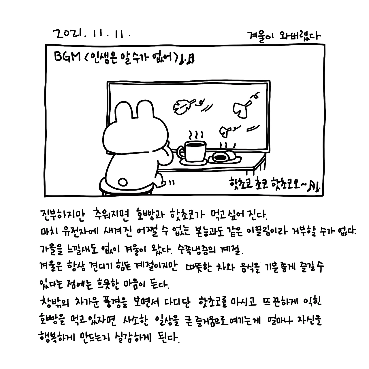 창밖의 차가운 풍경을 보면서 다디단 핫초코를 마시고 뜨끈하게 익힌 호빵을 먹고 있자면 사소한 일상을 큰 즐거움으로 여기는 게 얼마나 자신을 행복하게 만드는지 실감하게 된다.