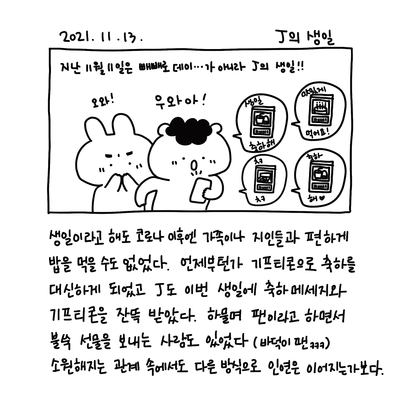 생일이라고 해도 코로나 이후엔 가족이나 지인들과 편하게 밥을 먹을 수도 없었다. 언제부턴가 기프티콘으로 축하를 대신하게 되었고 J도 이번 생일에 축하 메시지와 기프티콘을 잔뜩 받았다.