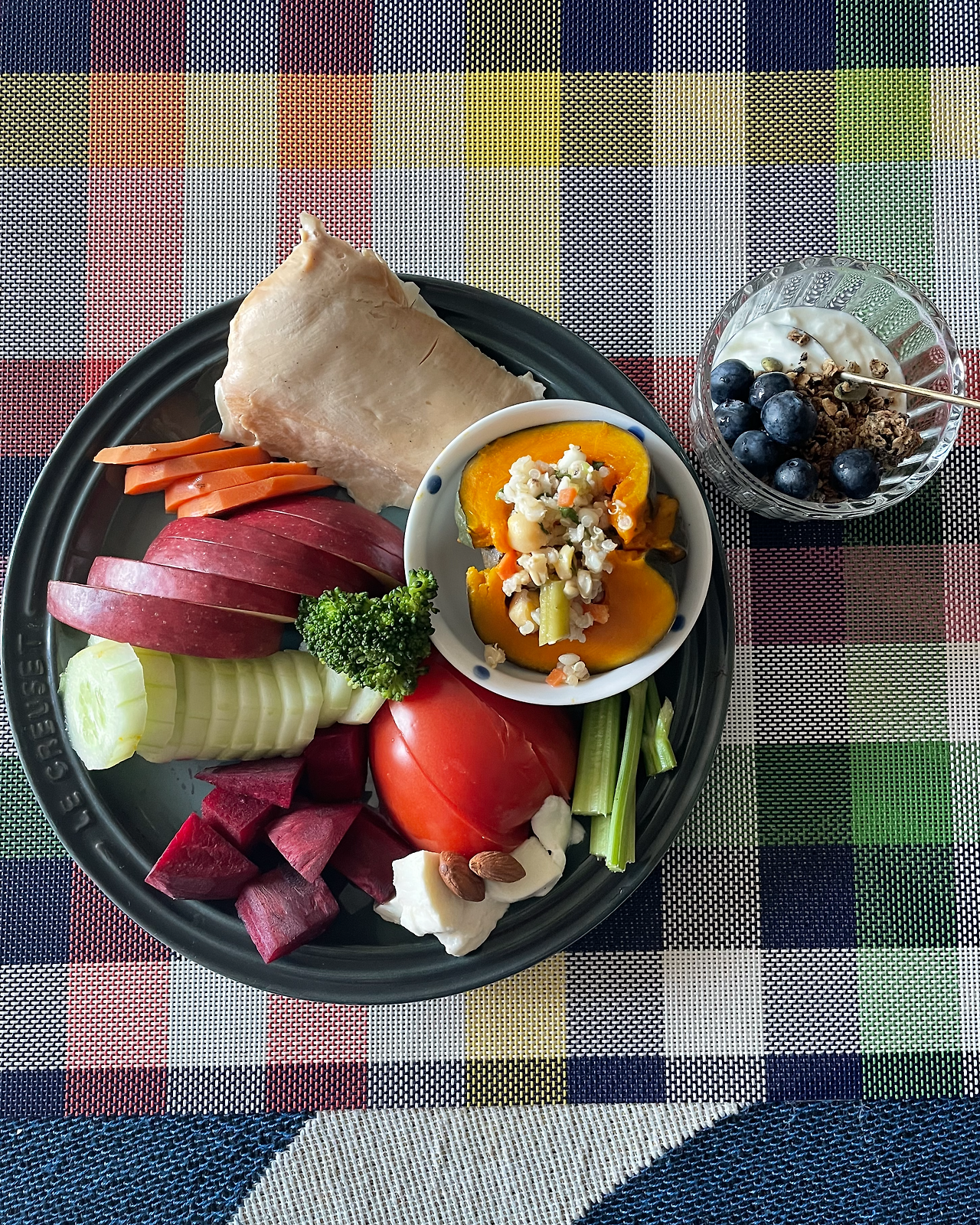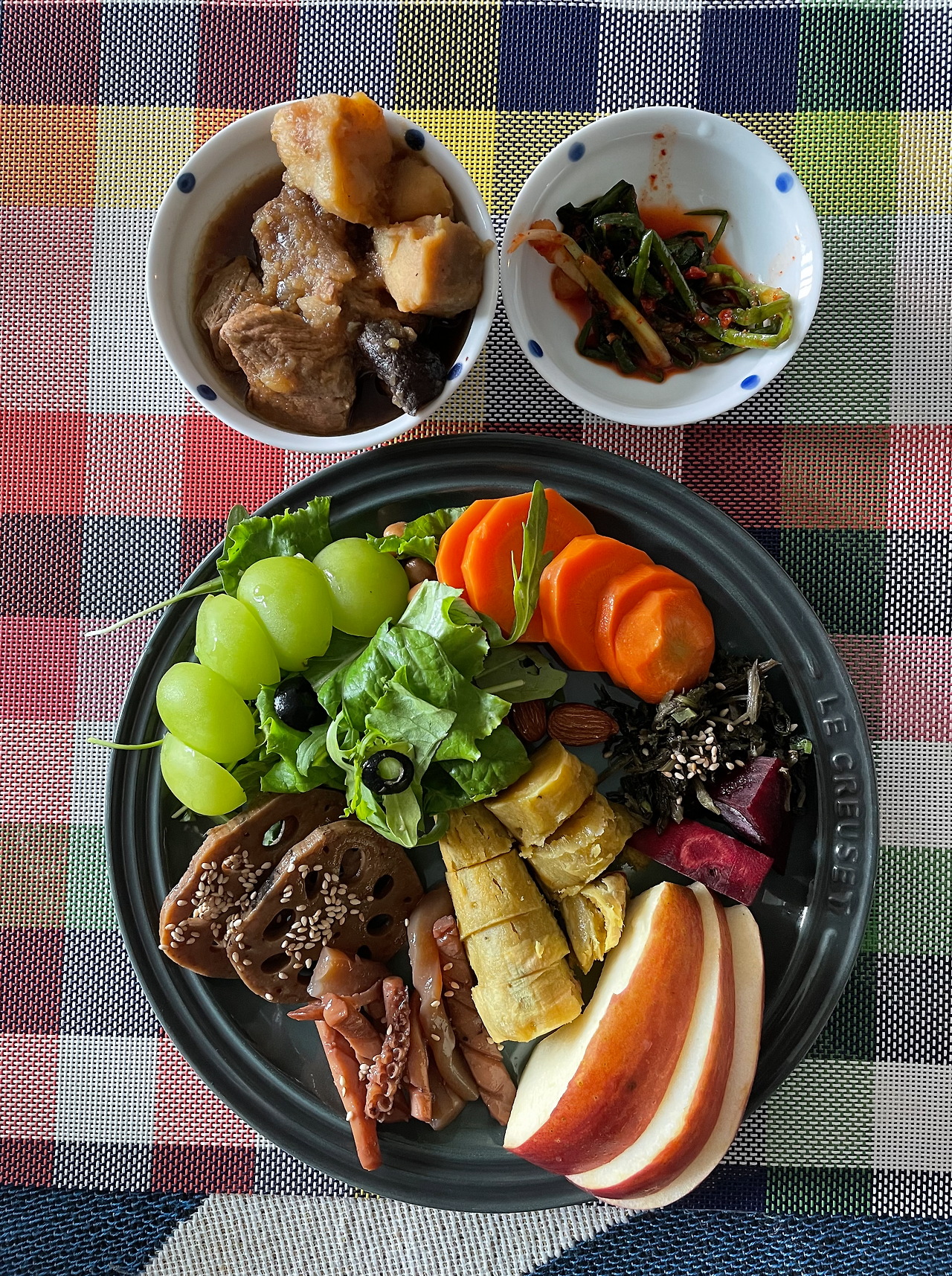 어머님께서 만들어주신 갑오징어 간장조림, 연근조림, 닭조림, 파김치, 야채, 나물, 당근, 비트, 고구마, 청포도, 사과, 아몬드 / 닭가슴살, 단호박, 콩 샐러드, 셀러리, 당근, 오이, 토마토, 모차렐라 치즈, 브로콜리, 그릭 요거트, 그래놀라, 블루베리, 아몬드