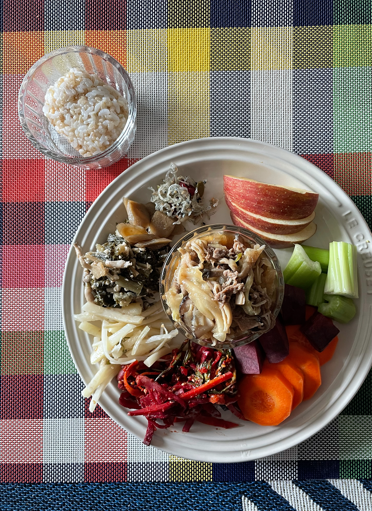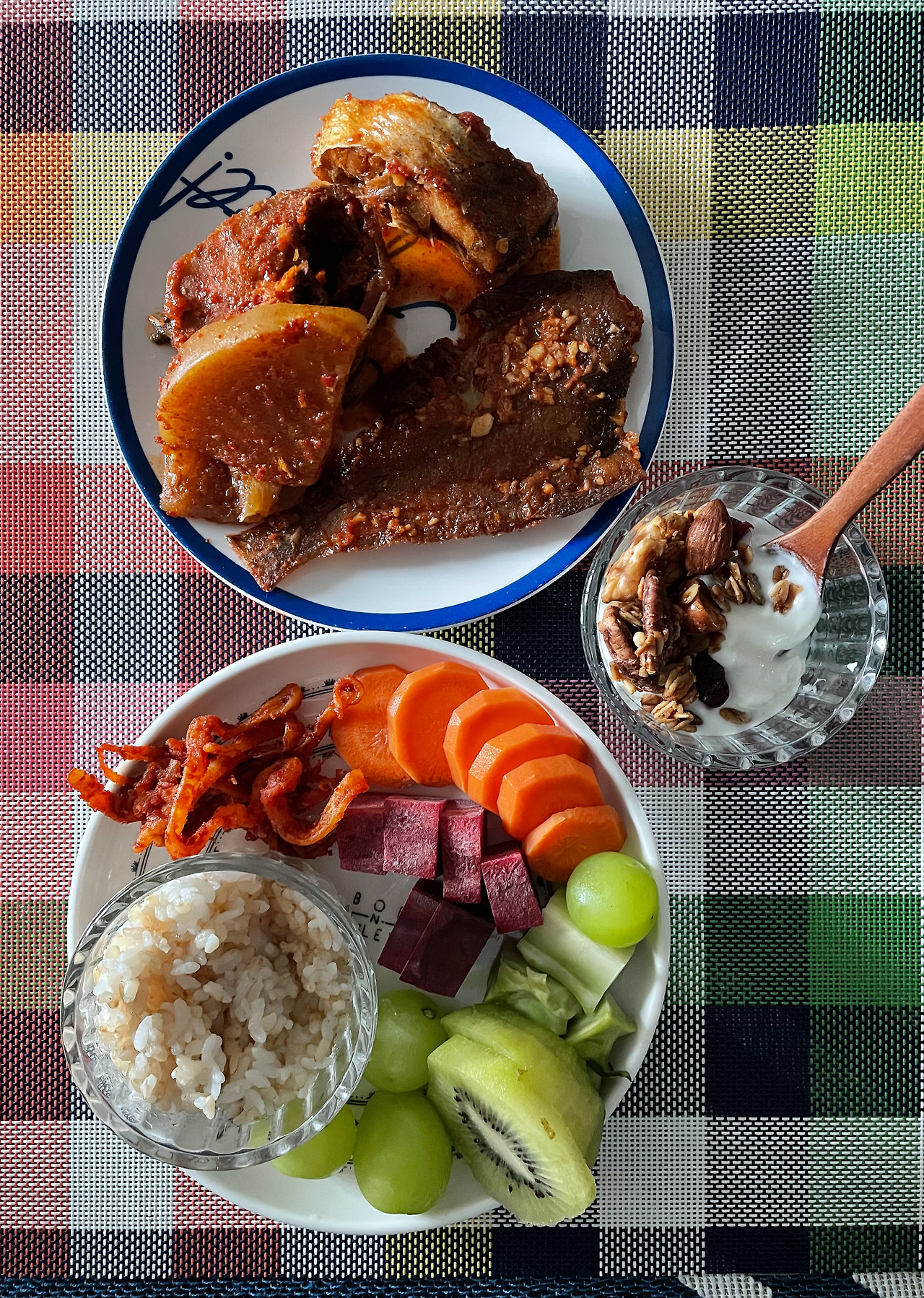 현미밥, 불고기 야채볶음, 우엉조림, 무&곤드레 나물, 멸치볶음, 셀러리, 셀러리&비트 야채무침, 당근, 비트, 사과 / 현미밥, 가자미식해, 진미채 고추장볶음, 브로콜리, 비트, 당근, 키위, 청포도, 그릭 요구르트, 그래놀라