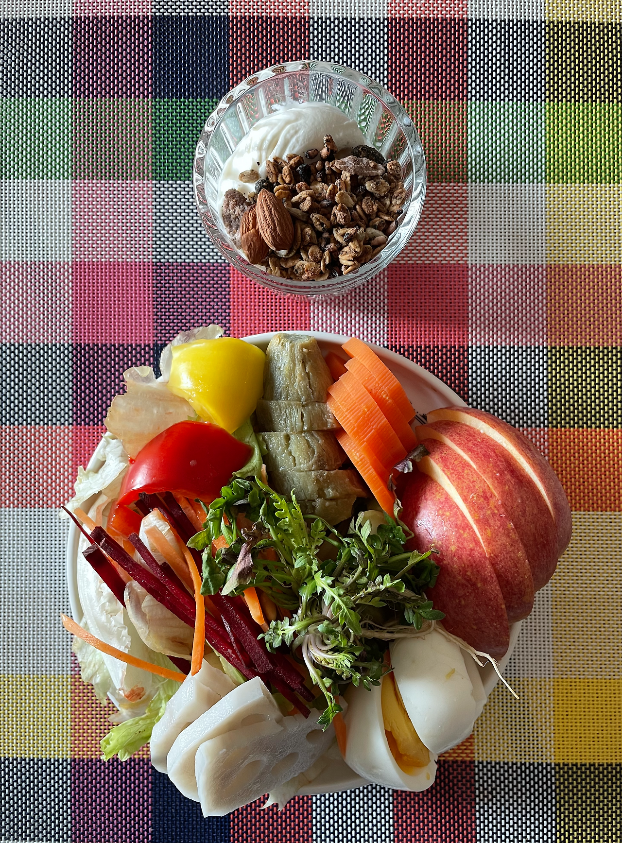 처음에는 생식으로 먹어도 되는 방울토마토, 오이만 먹다가 자료를 찾아보면서 조금씩 먹거리를 늘리다 보니 비트, 콜라비, 살짝 데친 브로콜리, 양배추, 병아리 콩, 연근 등으로 늘려가다 보니 컬러도 다양해지고, 처음 맛보는 자연 식재료에 감동을 느끼고 있다.