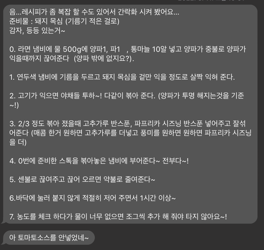 그러나 돼지고기보다 소고기 등심으로 하는 게 정석이긴 하나 쫄깃한 식감을 원한다면 돼지고기도 괜찮다고 신랑이 알려준 대로 구매하고, 깍둑썰기로 해달라고 재차 확인했었다. 집에 있는 식재료를 가르쳐준 대로 넣고, 재료가 불에 타지 않도록 불 앞에서 2시간을 계속 저어주었다.