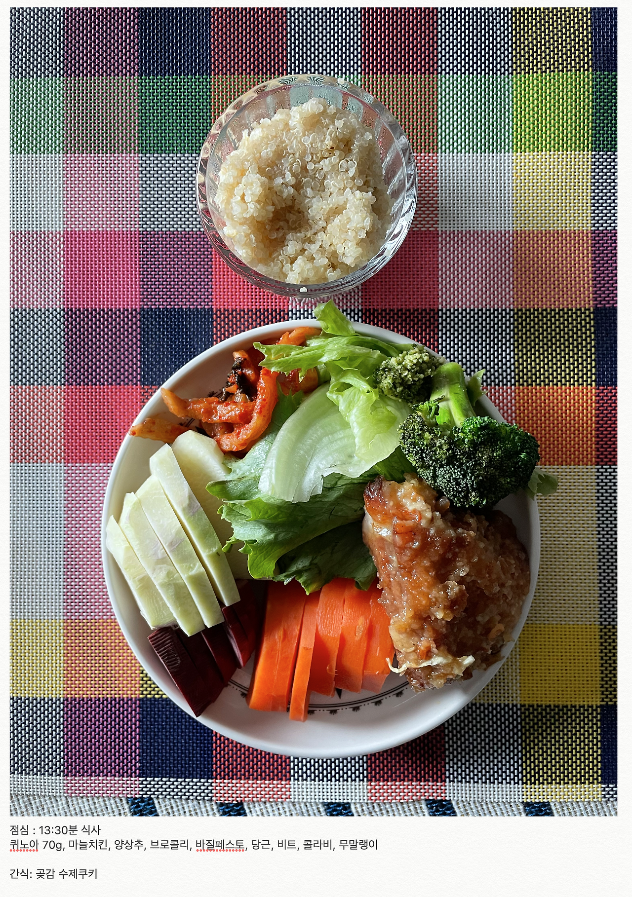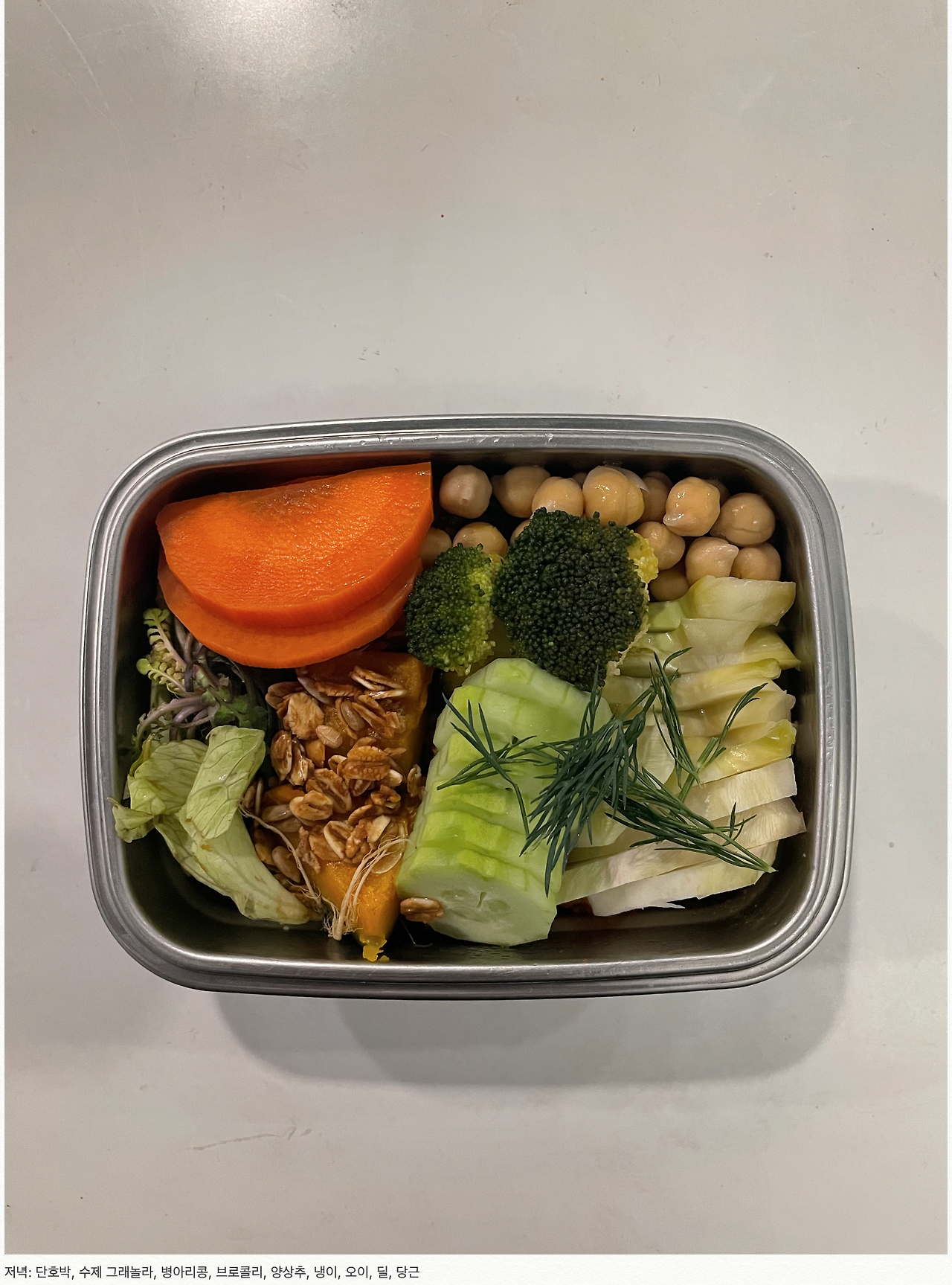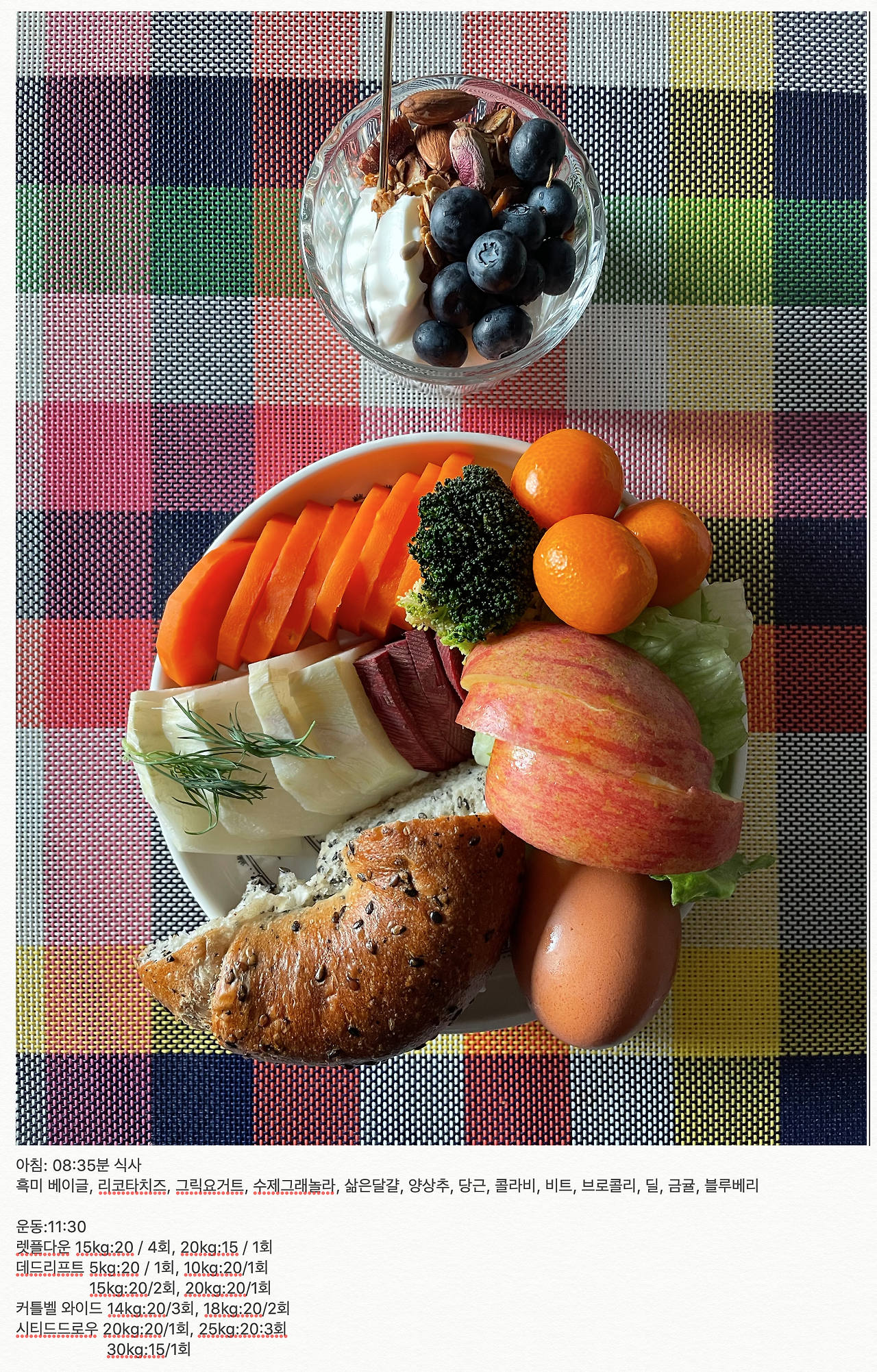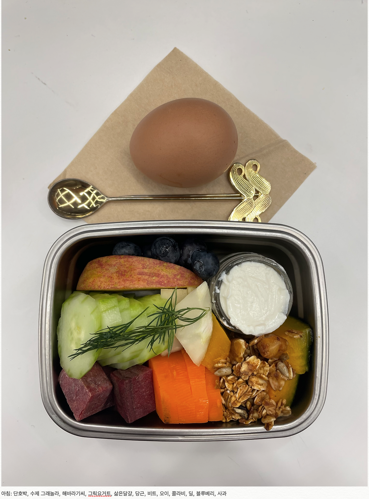 운동을 하기 전 아침 챙겨 먹는 것도 게을렀던 지난날을 반성하면서 간단히라도 접시에 담다 보면 한가득이다. 무산소 운동 이후 피곤하기도 하고, 귀찮은 마음에 대충 햄버거로 때울까 하는 마음이 굴뚝같지만, 배고픔을 참고 집까지 걸어와 냉장고 문을 열어 담아 먹고 나면 뿌듯해진다.
