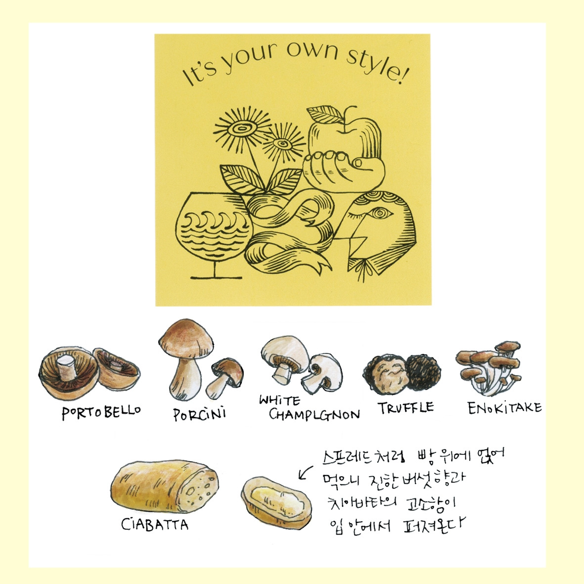 음식을 입 안으로 넣을 때, 감동을 받으면 나도 모르게 나오는 찌릿함이 있다. 우리는 항상 비싸야 맛있다고 생각하지만, 아주 사소한 부분에서도 행복을 느낄 수 있다. 살짝 맛을 보고, 궁금해 퇴근 후 이곳을 찾아왔다. 작은 공간에서 주는 온기와 친절함, 맛의 호기심으로 한참을 서성이다가 점심시간에 맛을 봤던 '머시룸 뒥셀'과 '치아바타', '잠봉'을 사들고 신나게 집으로 왔다.