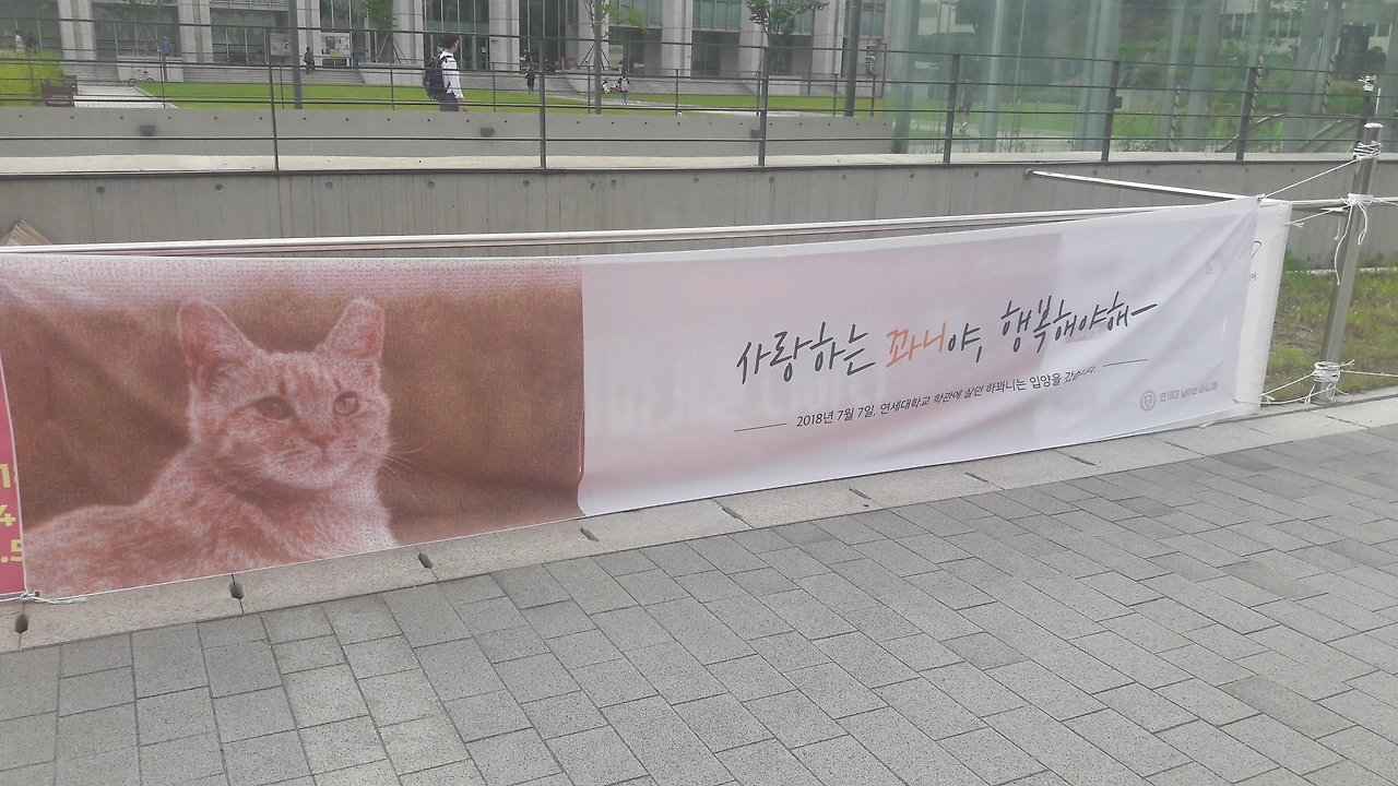 실습을 마치고 한 달여 만에 등교하던 날, 나는 오랜만에 학과니와 인사할 마음으로 녀석의 집 앞에서 걸음을 멈췄다. 집에 없는 걸로 보아 오늘은 아침 일찍부터 외출 중인 듯했다. 몸을 돌려 두어 발자국을 떼자마자, 학과니의 얼굴이 크게 프린트되어 있는 현수막이 눈에 들어왔다. 현수막에는 학과니가 7월 초 입양이 되었다는 글과 함께 학과니의 행복을 비는 말이 적혀 있었다.