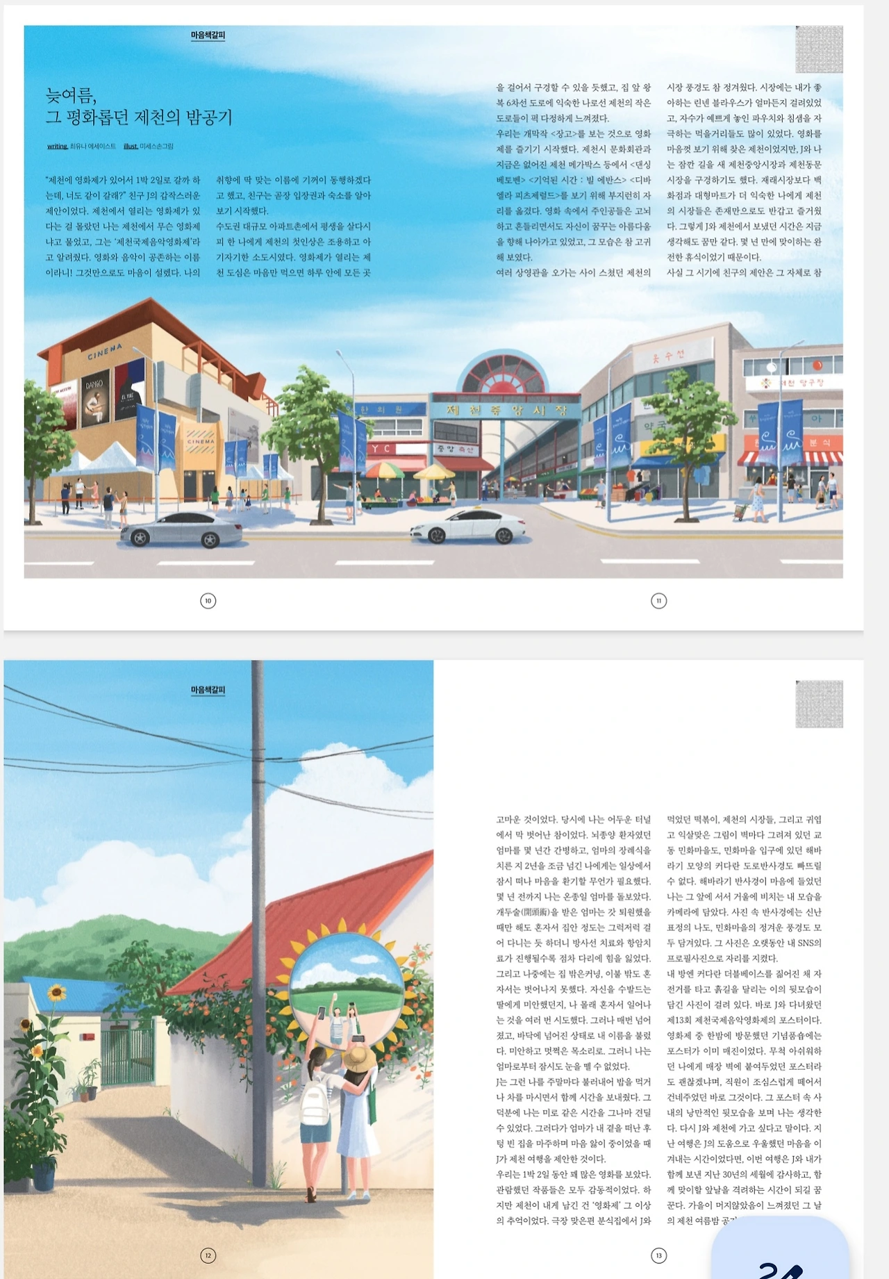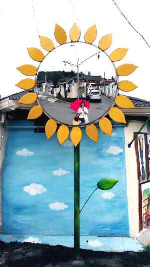 우리는 1박 2일 동안 여러 영화를 보았고, 관람했던 작품들은 모두 감동적이었다. 하지만 제천이 내게 남긴 건 ‘영화제’ 이상의 추억이었다. 극장 맞은편 분식집에서 J와 먹었던 떡볶이, 제천의 시장들, 그리고 귀엽고 익살맞은 그림이 벽마다 그려져 있던 교동 민화마을도, 민화마을 입구에 있던 해바라기 모양의 커다란 도로반사경도 빠뜨릴 수 없다. 해바라기 반사경이 마음에 들었던 나는 그 앞에 서서 거울에 비치는 내 모습을 카메라에 담았다. 사진 속 반사경에는 신난 표정의 나도, 민화마을의 정겨운 풍경도 모두 담겨있다. 그 사진은 오랫동안 내 SNS의 프로필 사진 자리를 지켰다.