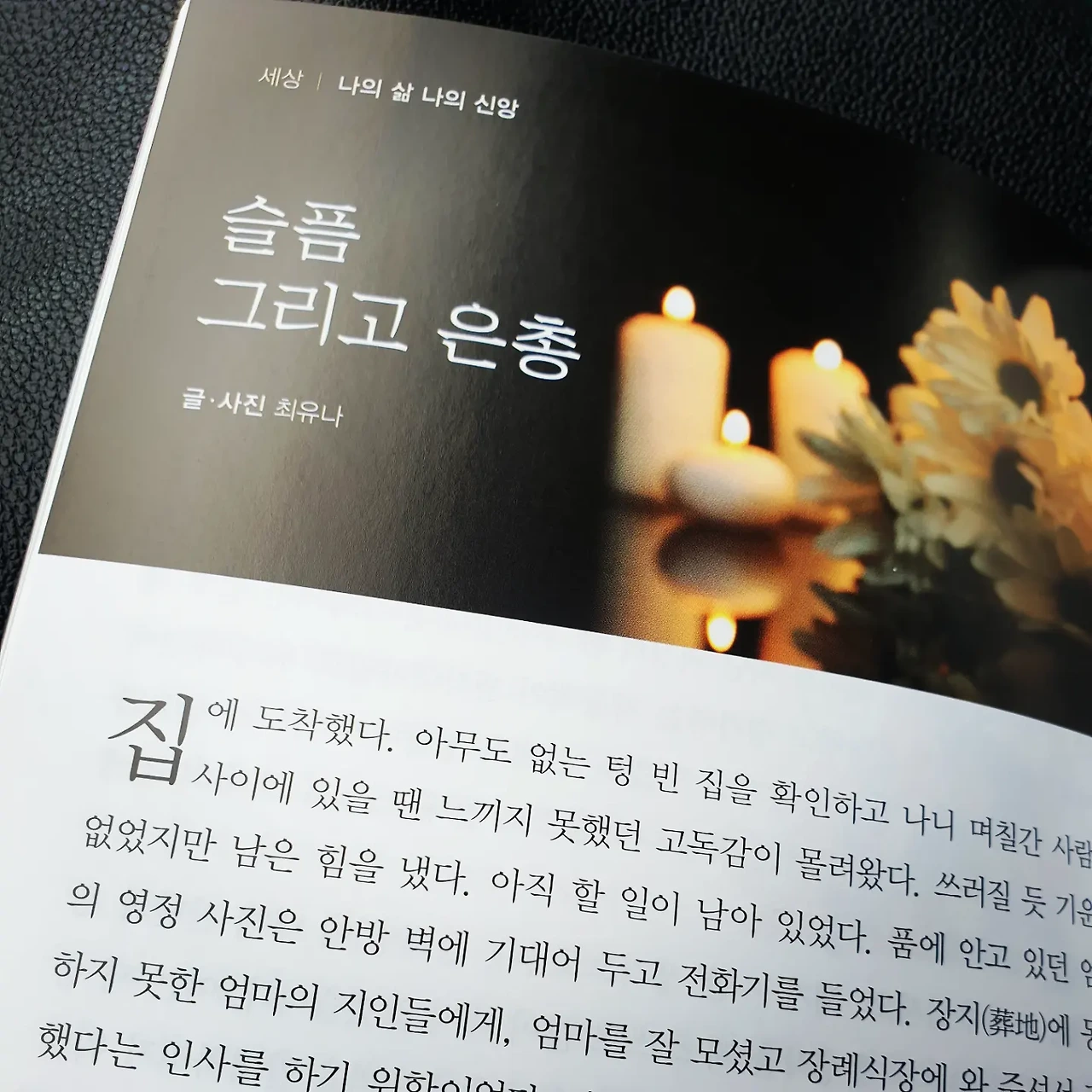 나는 몇몇 친한 이들에게 상황을 전하며 도움을 청했다. 그들은 담담하게 내 말을 듣고는 알겠다고 했다. 누구는 내가 갖고 있던 엄마의 사진을 받아 영정 사진을 만들어다 줬고, 누구는 내가 병원에서 지낼 수 있도록 세면도구와 음식을 가져다줬다. 그리고 또 누구는 늦은 밤, 돌아가신 엄마를 병원에서 성당 장례식장으로 모실 때 동행해 줬다. 신기하게도 모든 순간에 누군가가 내 곁에 반드시 있었다.