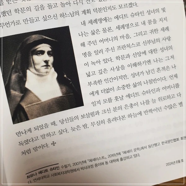 내 세례명에는 에디트 슈타인 성녀의 빛나는 삶은 물론, 세례명으로 내 꿈을 지지해 주던 어머니의 마음, 그리고 귀한 세례명을 일러 주신 프란치스코 신부님의 사랑이 녹아 있다. 학문과 신앙에 대한 성녀의 넓고 깊은 사상을 이해하기엔 나는 그저 부족한 인간이지만, 성녀가 남긴 흔적은 나에게 더없이 소중한 삶의 나침반이다. 언제일지 모를 훗날 에디트 슈타인과 어머니를 만나게 되었을 때, 당신들의 보살핌과 크신 분의 은총이 나를 늘 위로하고 다독였다고 말하고 싶다. 늦은 밤, 무심히 올려다본 하늘에 반짝이던 수많은 별처럼 말이다.