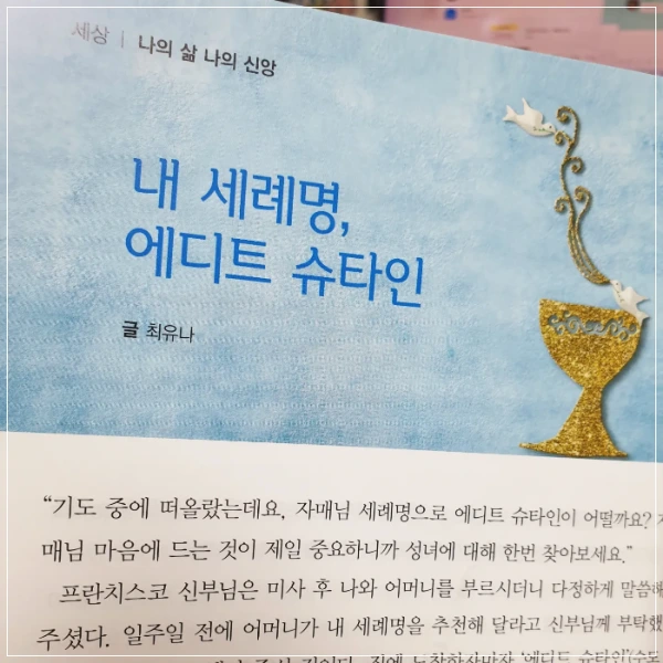 일주일 후, 신부님께 에디트 슈타인 성녀에 대해 찾아봤으며 성녀의 이름으로 세례를 받겠다고 말씀드렸다. 신부님은 흐뭇한 표정으로 알겠다고 하시며, 호칭은 ‘에디트’로 하면 된다고 알려 주셨다. 그때부터 신부님은 나를 ‘에디트 자매’라 부르셨고, 세례 후에는 모든 신부님이 나를 그렇게 부르셨다. 에디트 슈타인에 대해 잘 모르는 신부님들은 처음 듣는 세례명이라며 관심을 가져 주셨고, 아시는 분들은 참 좋은 이름이라며 무척 반가워하셨다. 그 말씀들에 괜히 어깨가 으쓱해졌다.