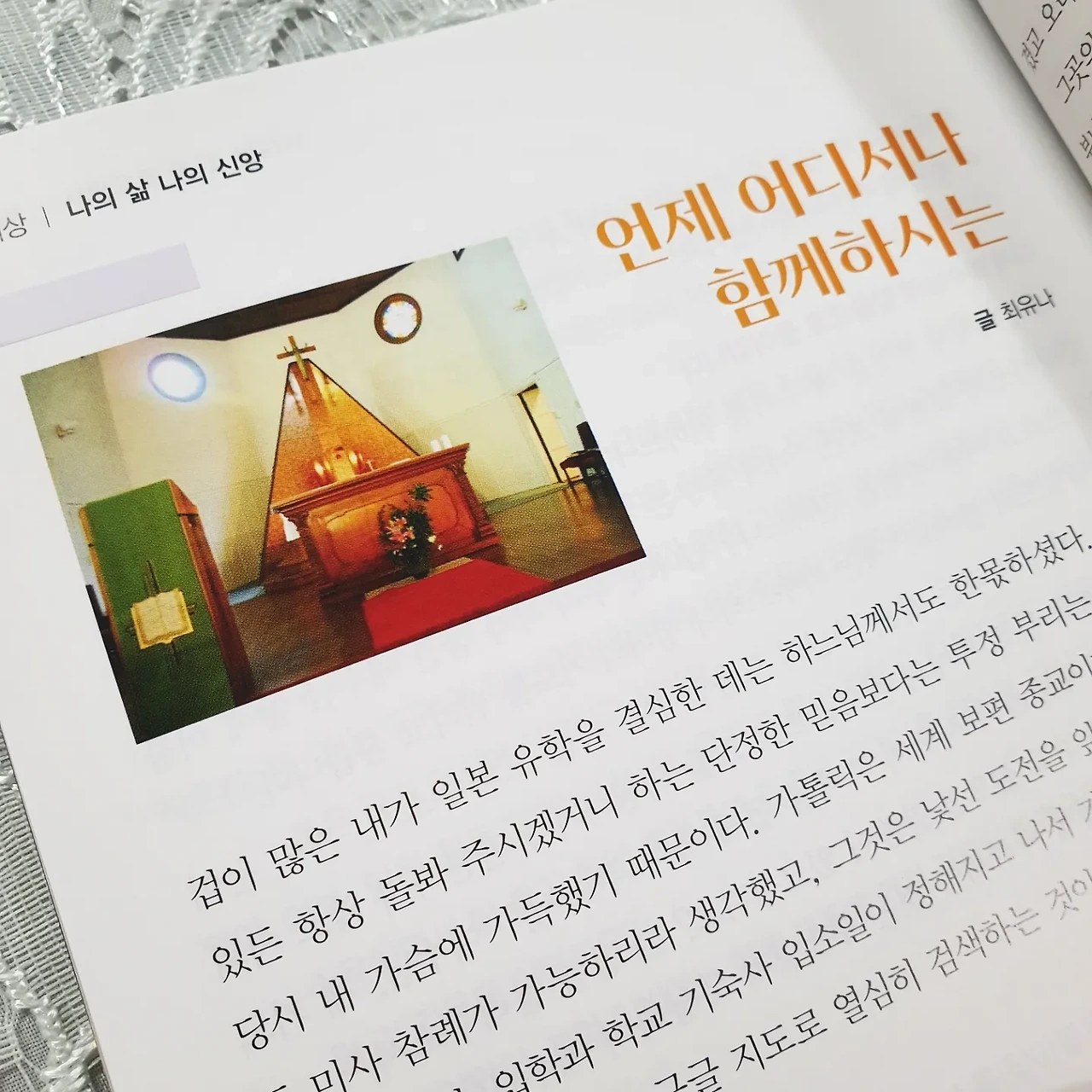 기숙사에서 성당까지 지름길을 찾기 위해 수없이 걸었던 도쿄의 골목길들. 주일 아침이면 기쁜 마음으로 향했던 성당 가는 길. 낯설었던 일본어 기도문이 어느 순간 귀에 들어오고 성가책 없이도 일본 성가 멜로디를 따라갈 수 있게 되었을 때의 기쁨. 일본인 신부님의 강론이 우리나라 신부님들이 해 주셨던 말씀과 일맥상통함을 느꼈을 때의 감동. 모두 내가 가톨릭 신자였기 때문에 맛볼 수 있었던 특별한 행복이자 은총이었다.