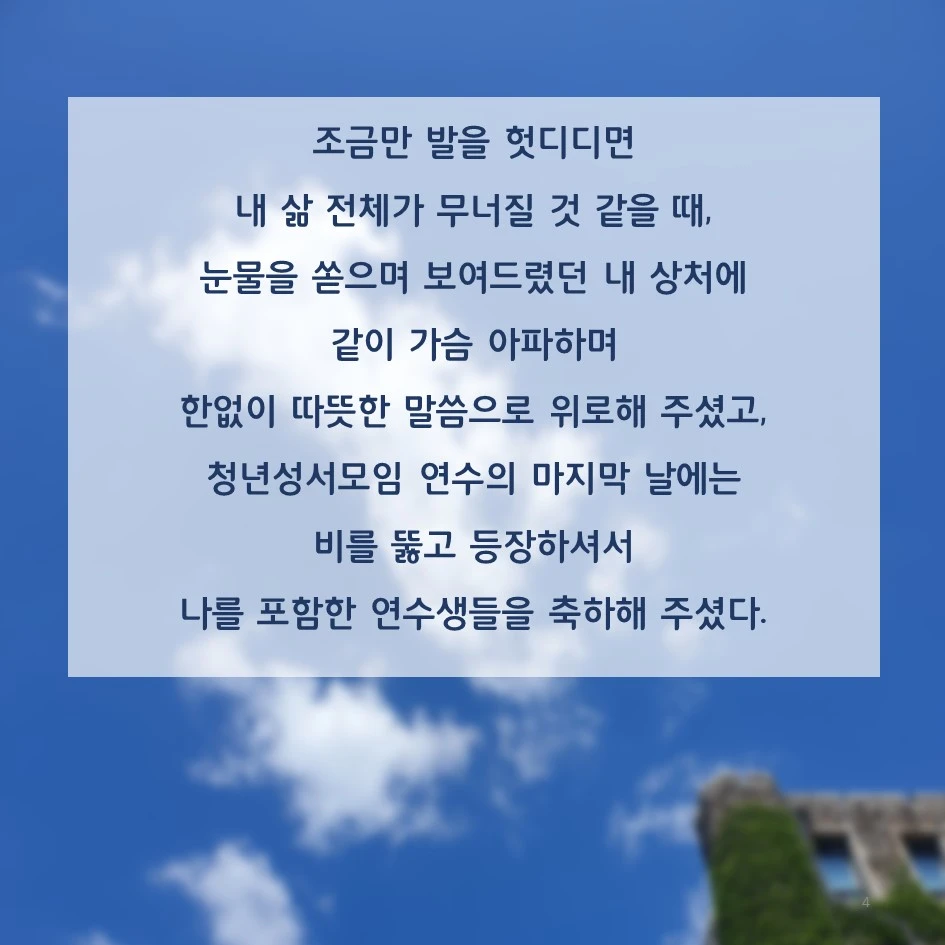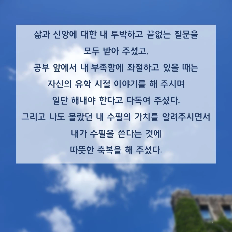 수필과 사회복지학과 신앙을 삶의 축으로 삼고 있습니다. 바르게 생각하고, 행동하고, 글쓰는 것을 업으로 삼으려 공부 중입니다.