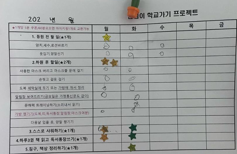 미취학시기에 하는 일은 등원준비(양치, 세수, 로션), 가방정리, 샤워하면 거의 하루 루틴이 끝난다.