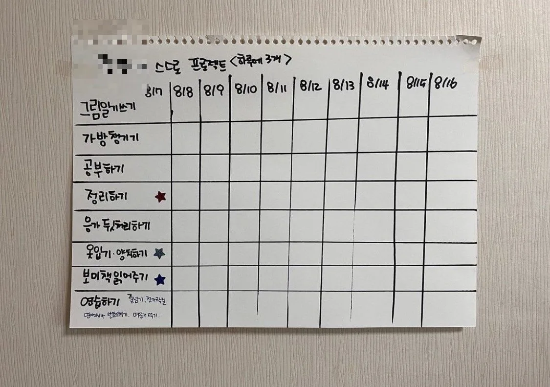 순서대로 할 일을 적어두고 성공하면 그때그때 스티커나 동그라미를 한다.