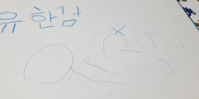 어느 날, 첫째에게 '이름을 써보자!' 하며 스케치북에 이름을 적어주니 따라 쓰며 즐거워했다.