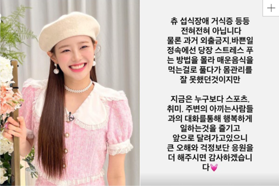 저는 개인적으로 이런 사실이 참 안타깝습니다. 이미 이런 증상으로 인해 고통받고 있는 것이 자명한데 타이틀만 없앤다고 해서 그 사실이 달라질까요..? 츄뿐 아니라 감히 추측건대 대부분의 아이돌은 섭식장애를 겪을 수밖에 없는 환경에 처해 있습니다. 물론 이는 아이돌뿐 아니라 외모로 평가받는 배우, 모델, 무용수 등에도 해당되는 말이지요.